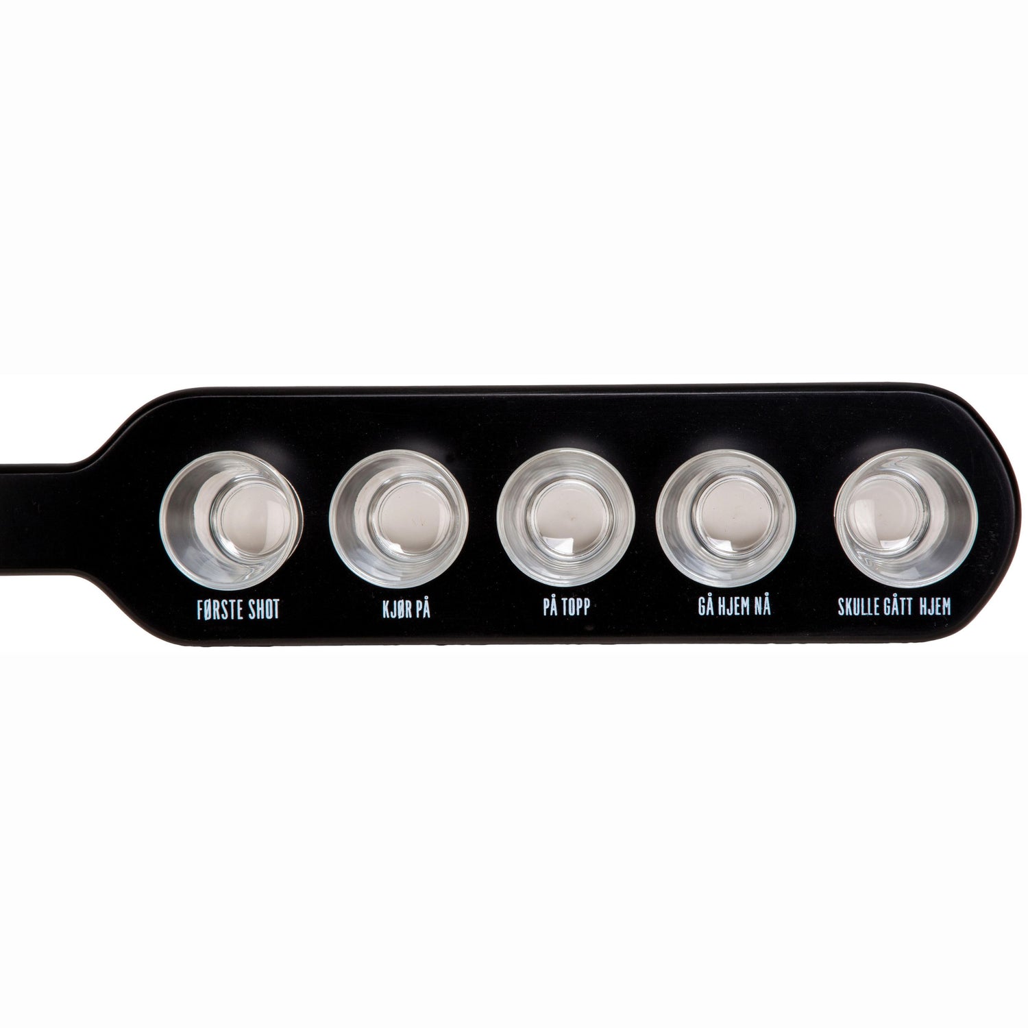 Dekorativ shotglassplanke i sort tre med 5 glass og humoristisk tekst under hvert glass. Perfekt til festlige anledninger, bursdager, utdrikningslag eller som en gave med glimt i øyet. Laget i solid tre med praktisk tau til oppheng og servering.