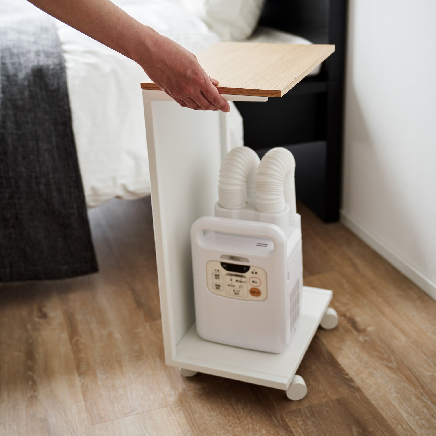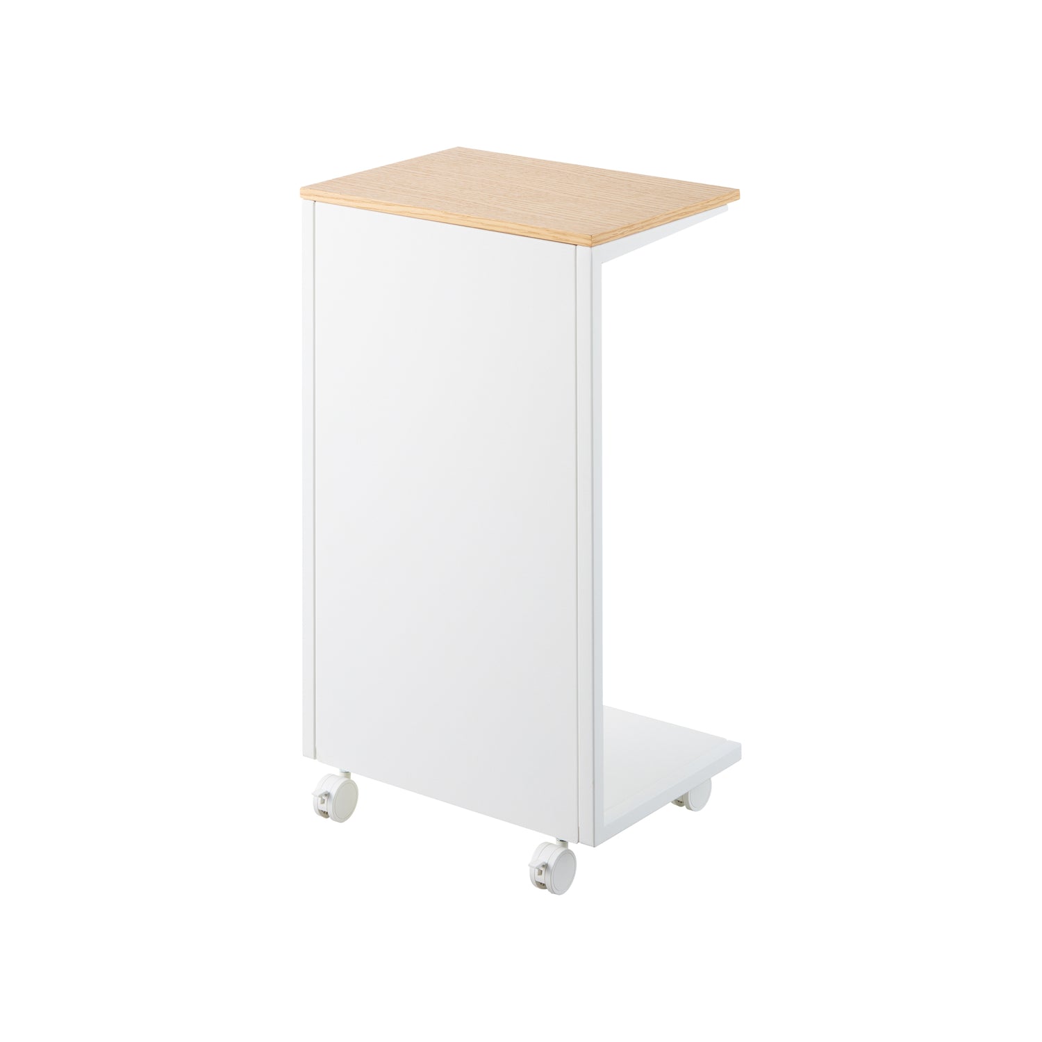 Et praktisk og fleksibelt bord som passer like godt ved sofaen som ved sengen. Bordet har lettgående hjul som gjør det enkelt å flytte, og en overflate i lys tre som gir et varmt uttrykk mot den hvite rammen.