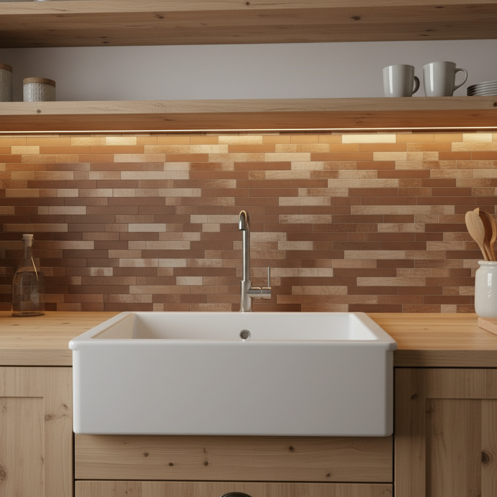 Sofie stav selvklebende veggfliser er råtøffe fliser i metallisk bronsefarge med stavmosaikk. Veldig tøff sammen med mørke kjøkken.