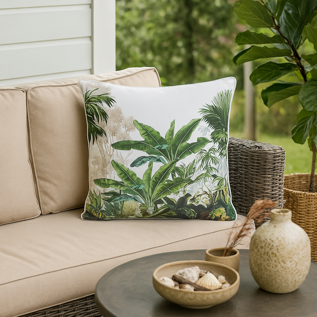 Dekorativ pyntepute med tropisk print i grønne og beige toner. Med palmeblader og jungelinspirert mønster gir den en eksotisk og avslappet stil til både stue, soverom eller uterom.