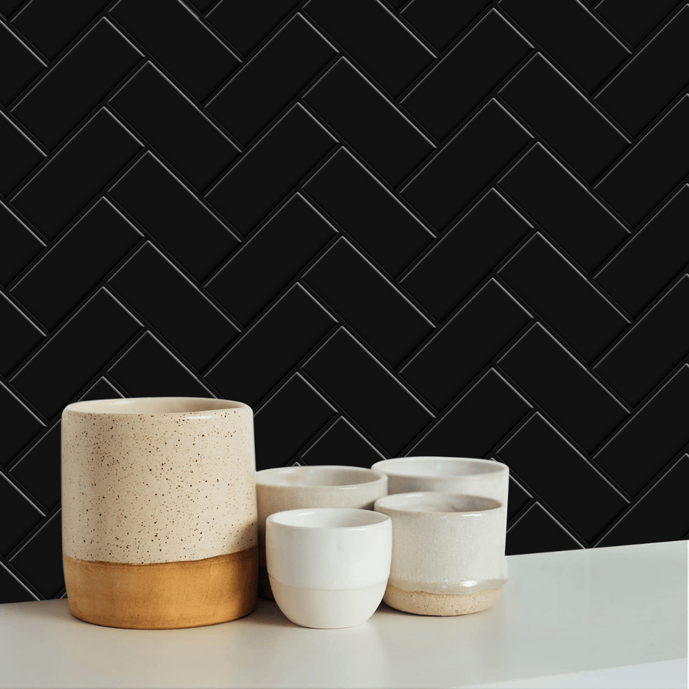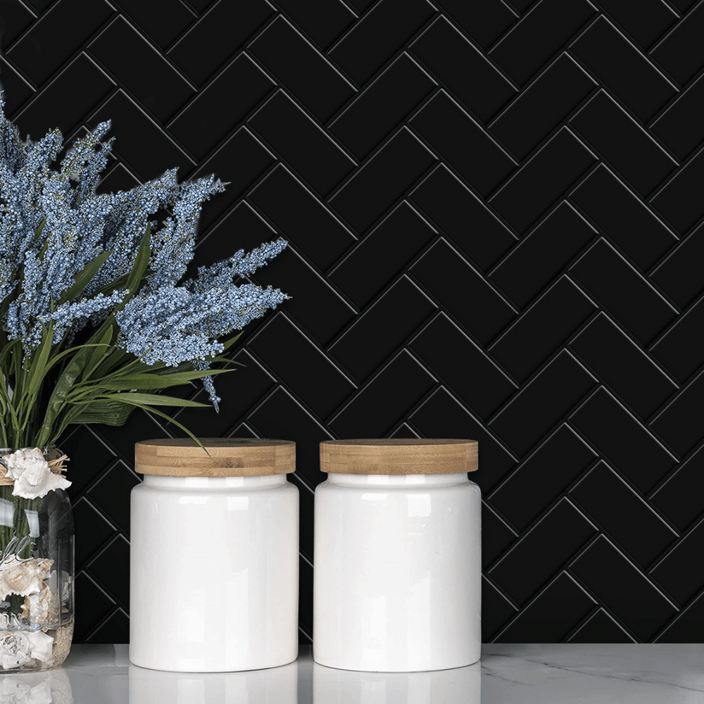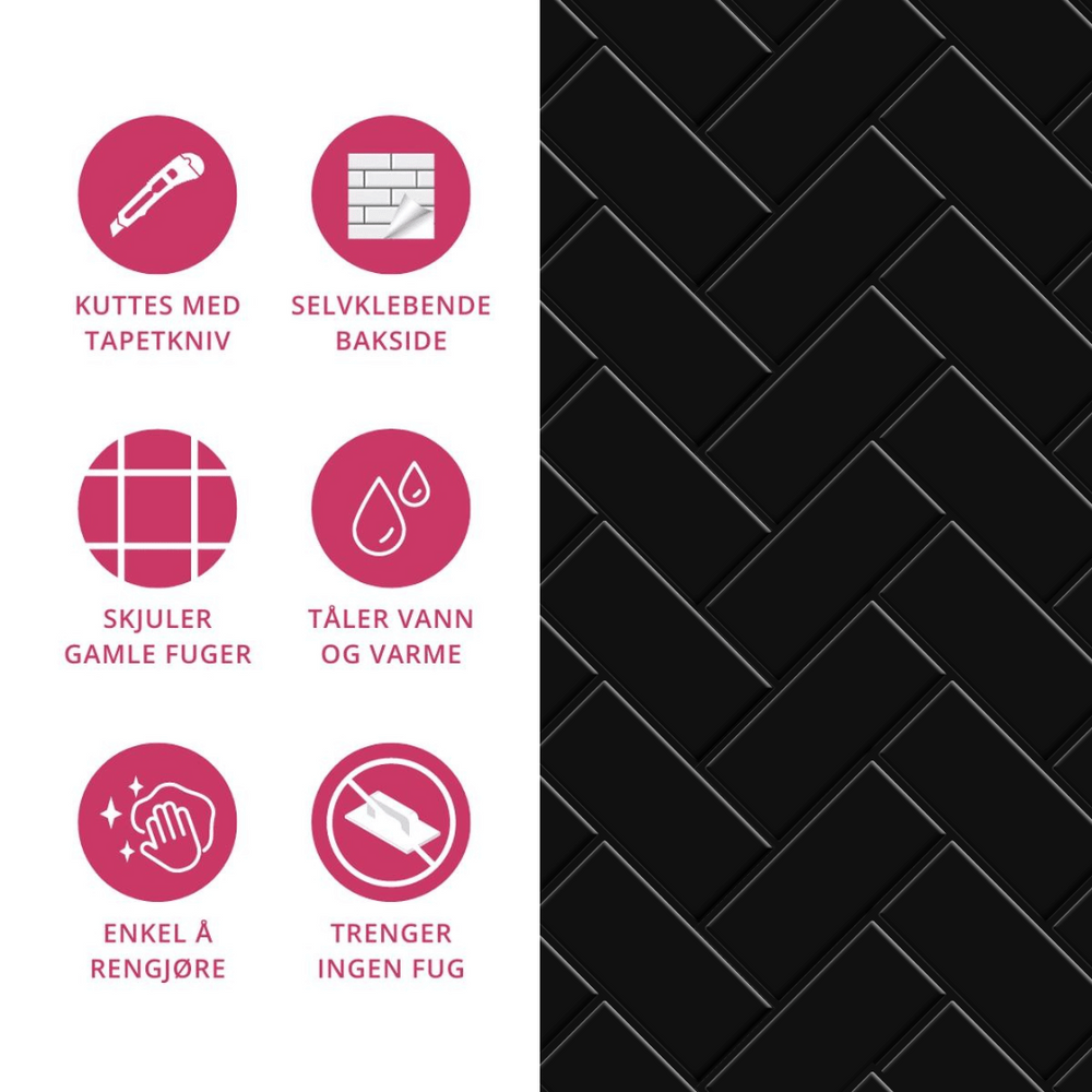 Selvklebende svarte fliser i fiskebeinsmønster – moderne og tidløse veggfliser til kjøkken og bad.