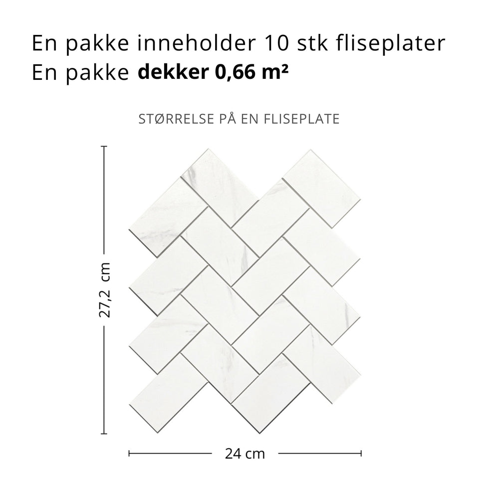 Stein fiskebein marmor selvklebende veggfliser kombinerer klassisk marmorlook med et moderne fiskebeinsmønster. Designet består av hvite fliser med diskré grå marmorering og en sval undertone – perfekt for skandinavisk stil. Flisene gir en elegant og tidløs vegg som passer utmerket over kjøkkenbenken, i gang eller på vaskerom.
