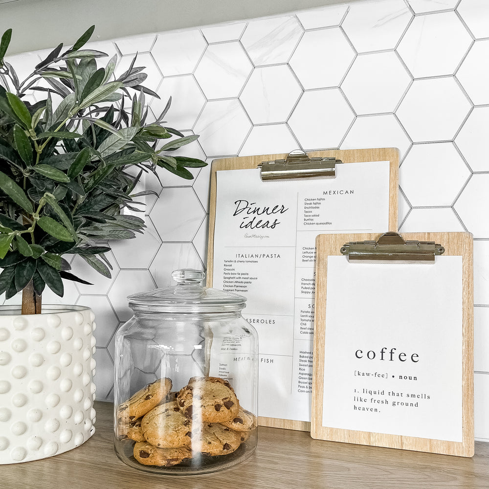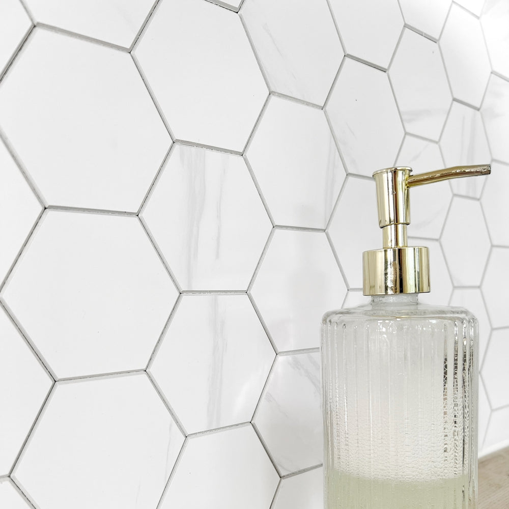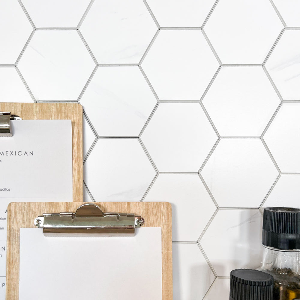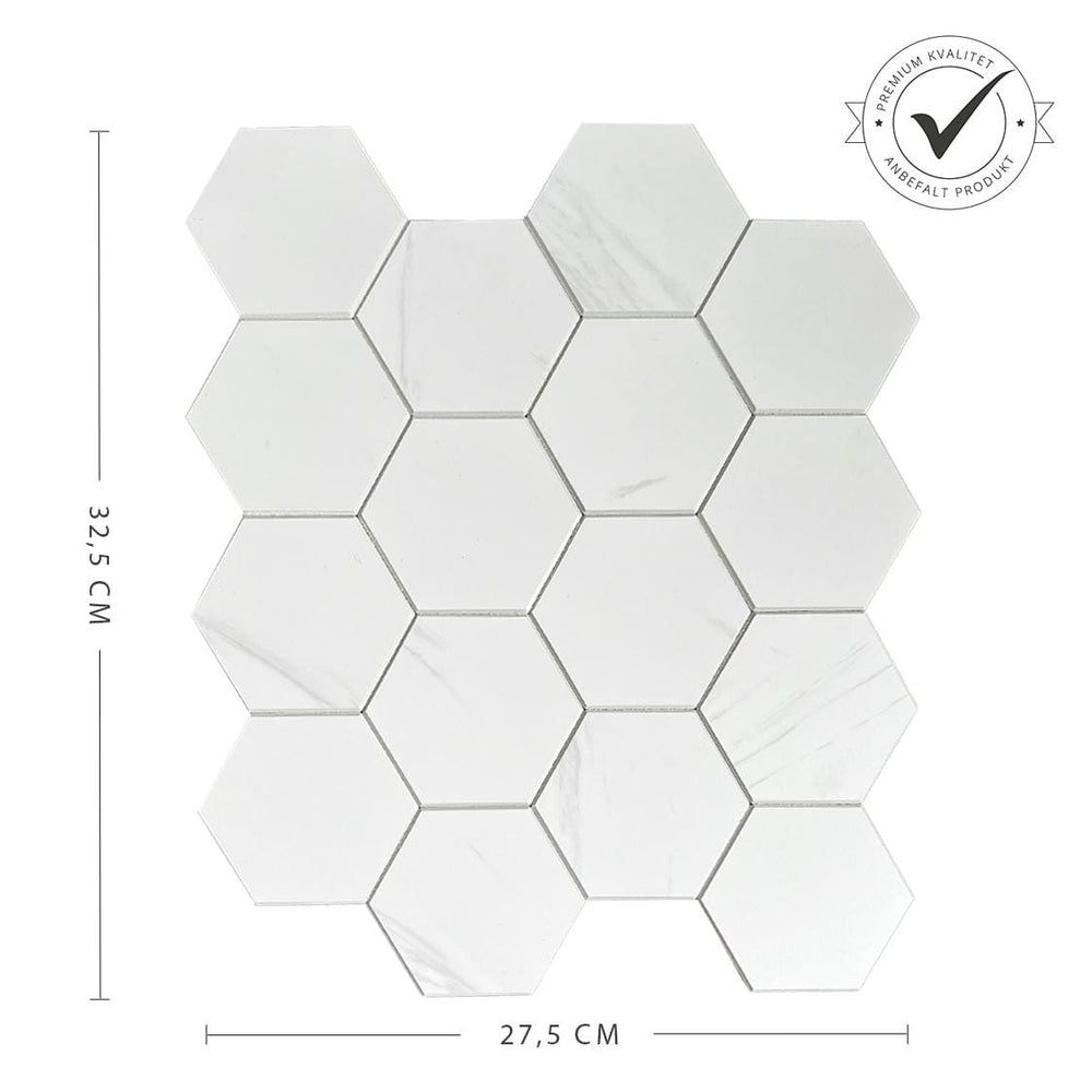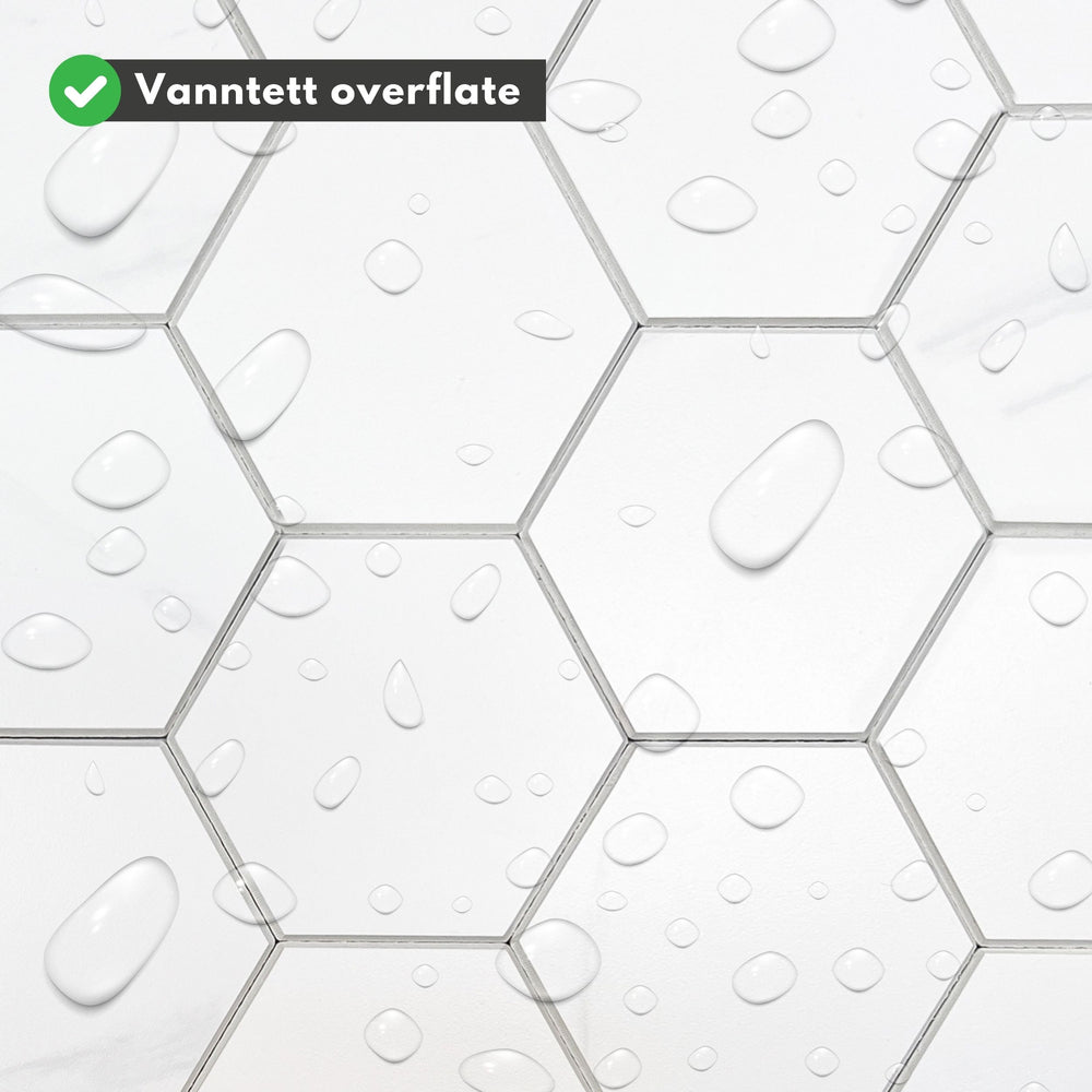 Stein hexagon selvklebende veggfliser er et stilfullt og moderne valg for oppussing av kjøkkenvegger. Flisene imiterer hvit marmor med delikat grå marmorering og har en kjølig undertone som passer perfekt til både varme og nøytrale fargepaletter. Hver flis har sekskantet form og ferdig påført grå fug for et sømløst og profesjonelt uttrykk. Den selvklebende baksiden gjør monteringen enkel. Helt uten behov for lim, fugemasse eller spesialverktøy.