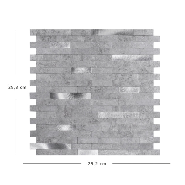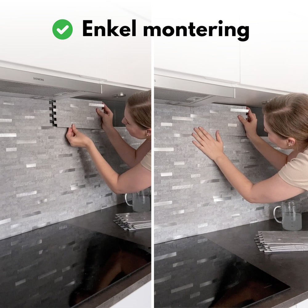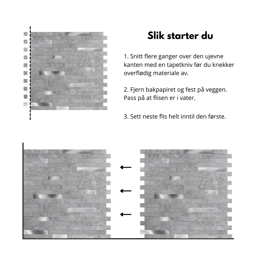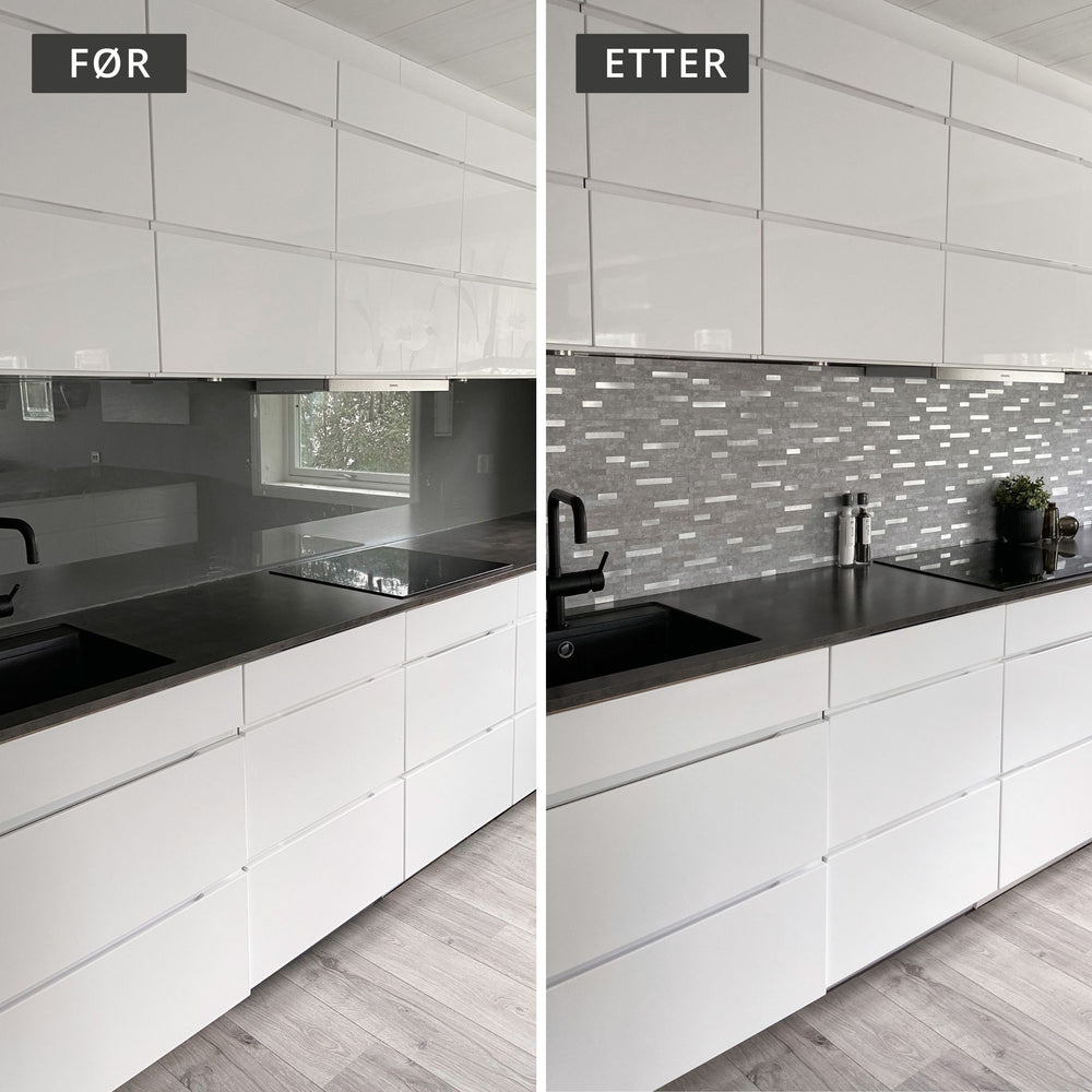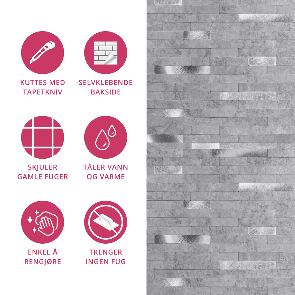 Stein lys grå selvklebende veggfliser gir kjøkken og vaskerom et moderne og eksklusivt uttrykk. Flisene etterligner stavmosaikk i naturtro steinlook, med delikate nyanser av grått og elegante innslag av sølvfarget aluminium. Dette gir overflaten dybde og en luksuriøs følelse. De selvklebende flisene festes enkelt direkte på veggen – helt uten lim, fug eller spesialverktøy.