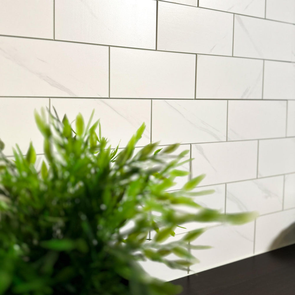 Stein Subway marmor selvklebende veggfliser imiterer klassisk hvit marmor med delikate grå marmoreringer og har ferdig grå fuger for et naturlig uttrykk. De selvklebende arkene monteres enkelt uten lim eller fugemasse, perfekt for rask oppgradering av kjøkken, bad eller vaskerom.