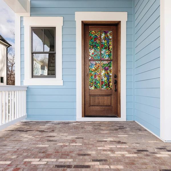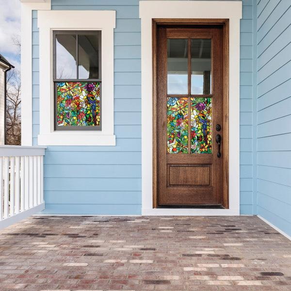 Tulia vindusfolie med fargerikt blyglass-design, blomster og øyenstikkere