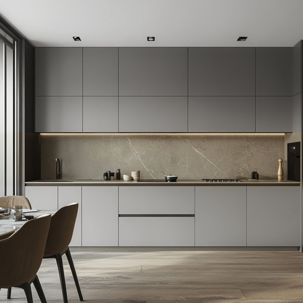 En varm, grå matt kontaktplast som egner seg godt til å fornye slette kjøkkenskap, eldre garderober og mye mer. Den er ofte brukt til å forny skjenker som Bestå fra IKEA.