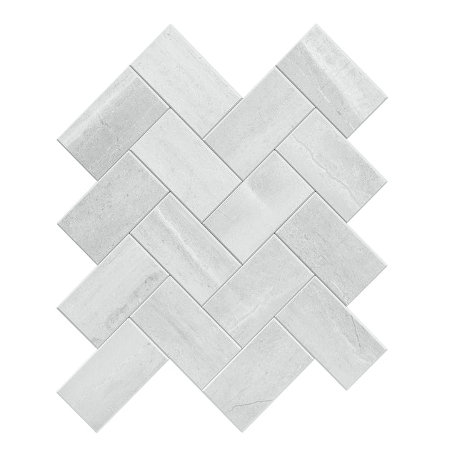 Utforsk hvordan Vilde selvklebende fliser kan løfte interiøret ditt med denne vareprøven. Flisen har et klassisk fiskebensmønster i en myk, lysegrå steinfinish som gir et sofistikert og moderne preg til veggene.
