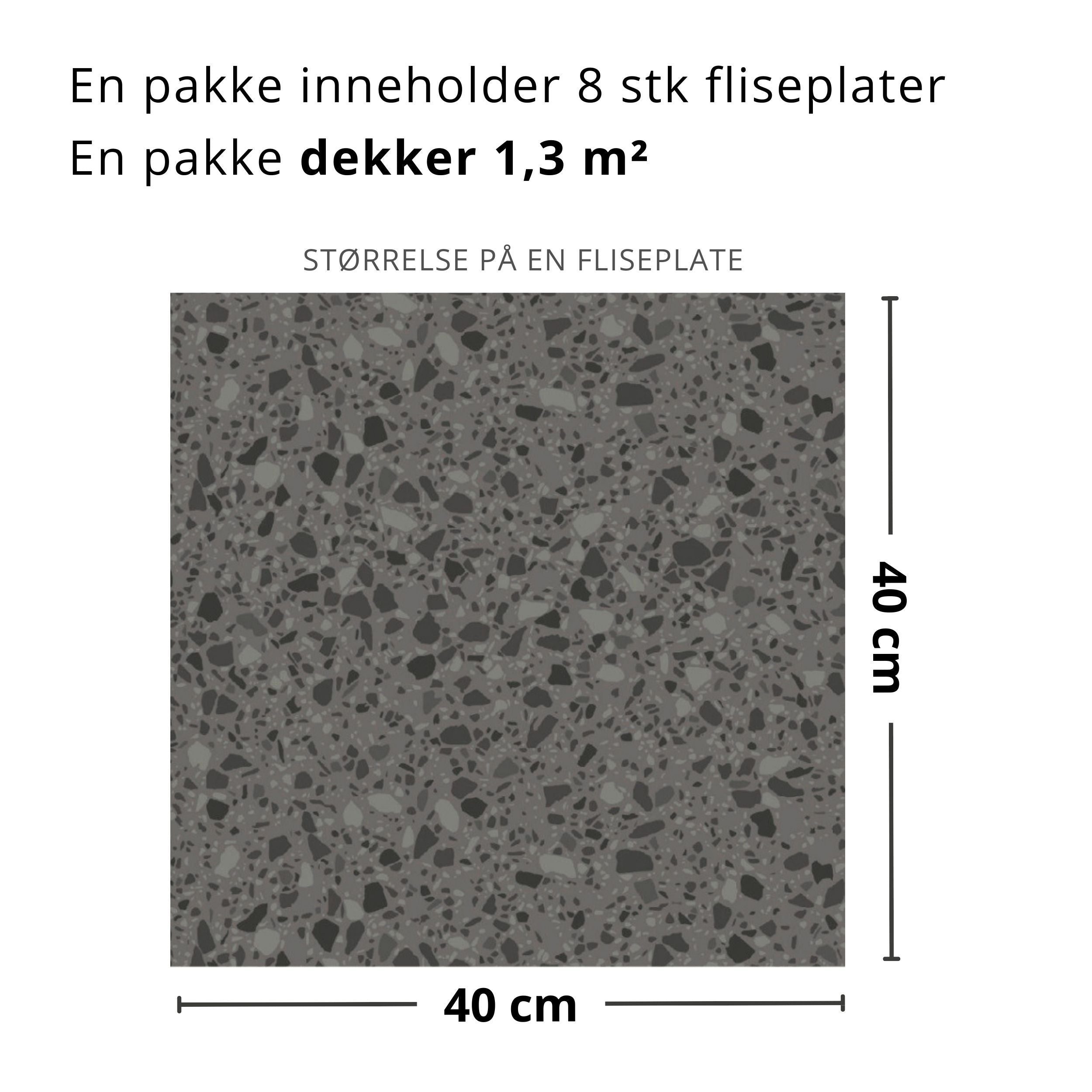 Venezia terrazzo selvklebende fliser er rett og slett rålekre. Flisene etterligner sort og grå terrazzo og har et moderne og stilrent design. Disse flotte flisene med eksklusiv look kan fornye gulvet eller veggen din - raskt og enkelt.