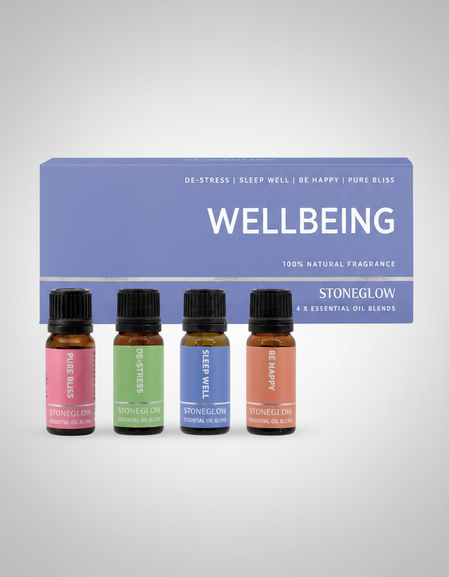 Gi deg selv eller noen du er glad i en pause fra hverdagen med Stoneglow Wellbeing Essential Oil Gift Set – et luksuriøst sett med 100% naturlige, veganske duftoljer som fremmer ro, balanse og velvære.