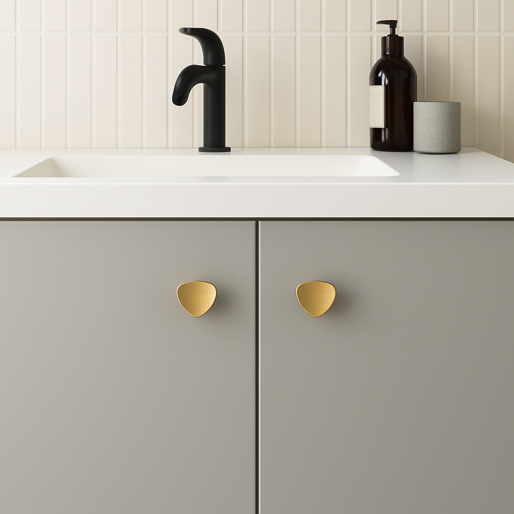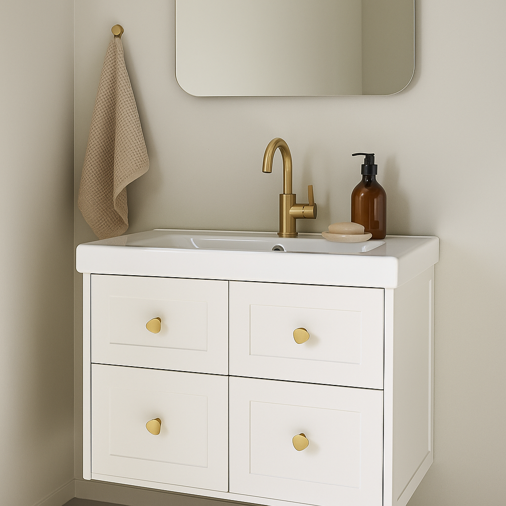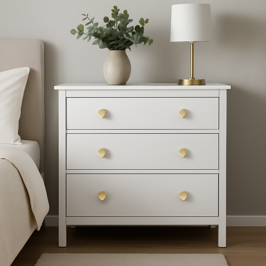 Cannes knott i børstet messing, 36 mm, montert på hvit kommode med tre skuffer i moderne soveromsinteriør.