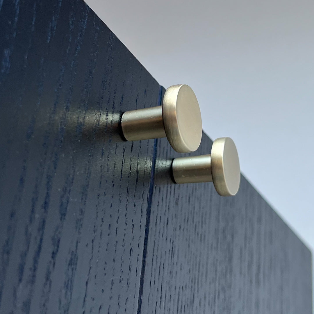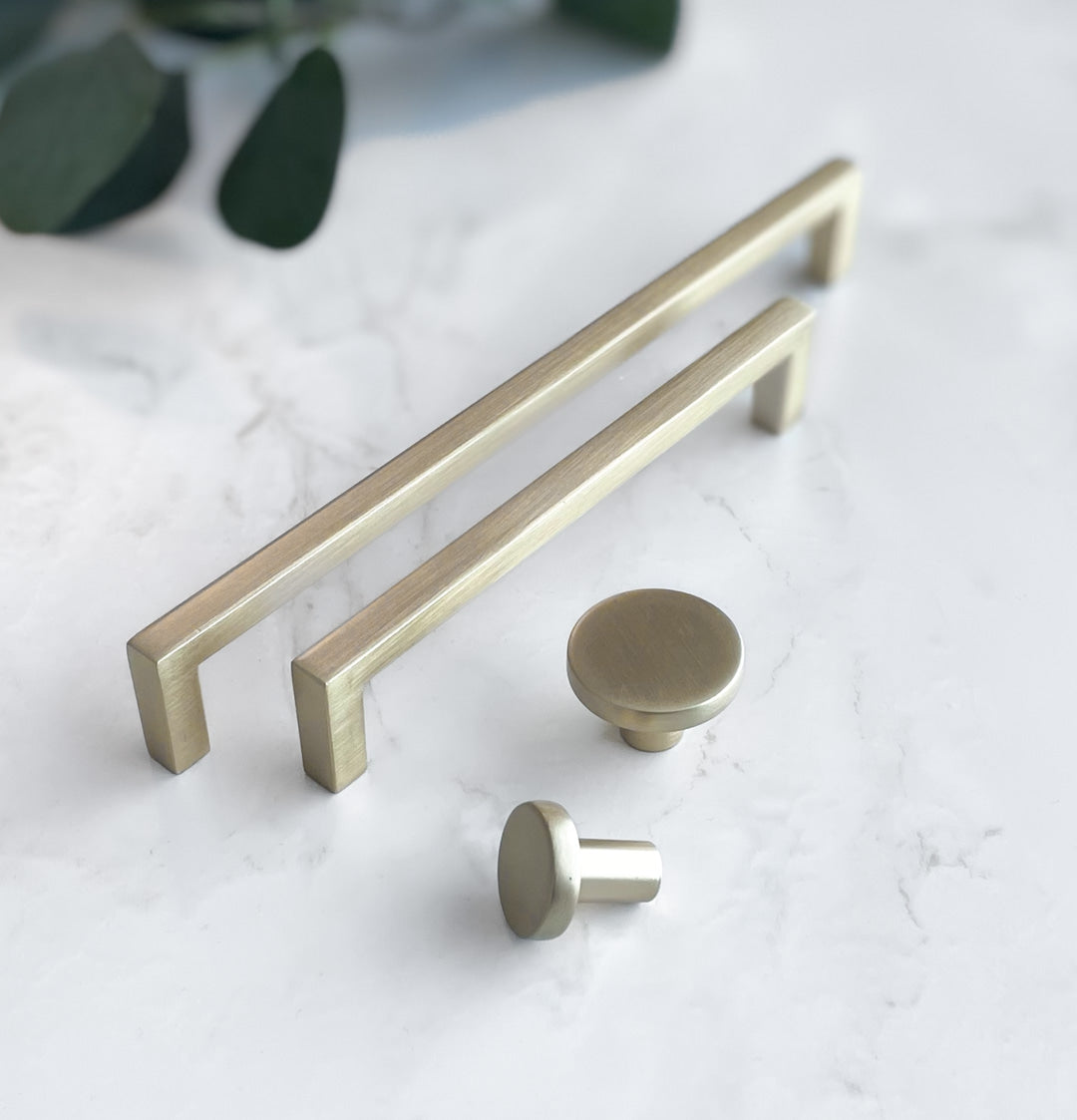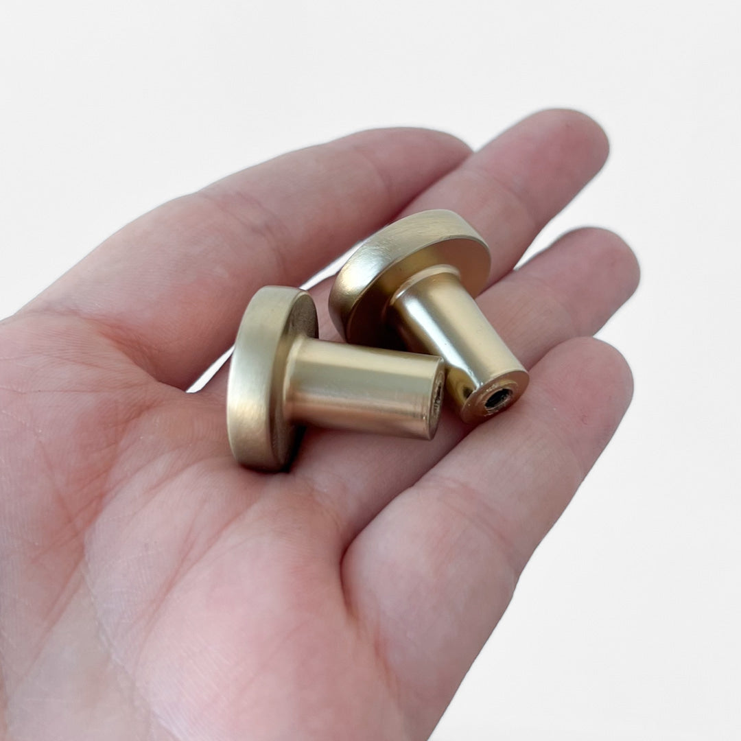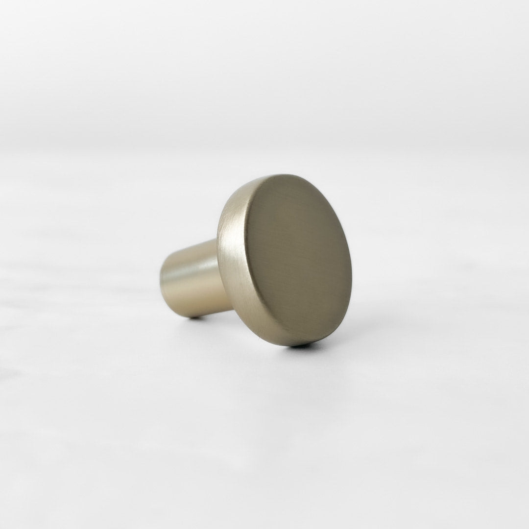Moderne knott i brøstet messing med minimalistisk design. Perfekt til å løfte skap, kjøkkeninnredningen, baderomsinnredningen, kommode eller nattbord med en vakker detalje i dempet gullfarge.