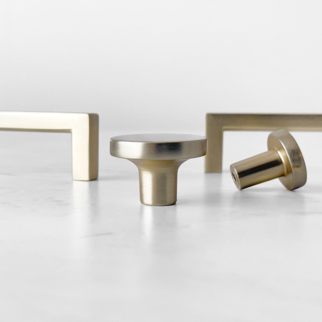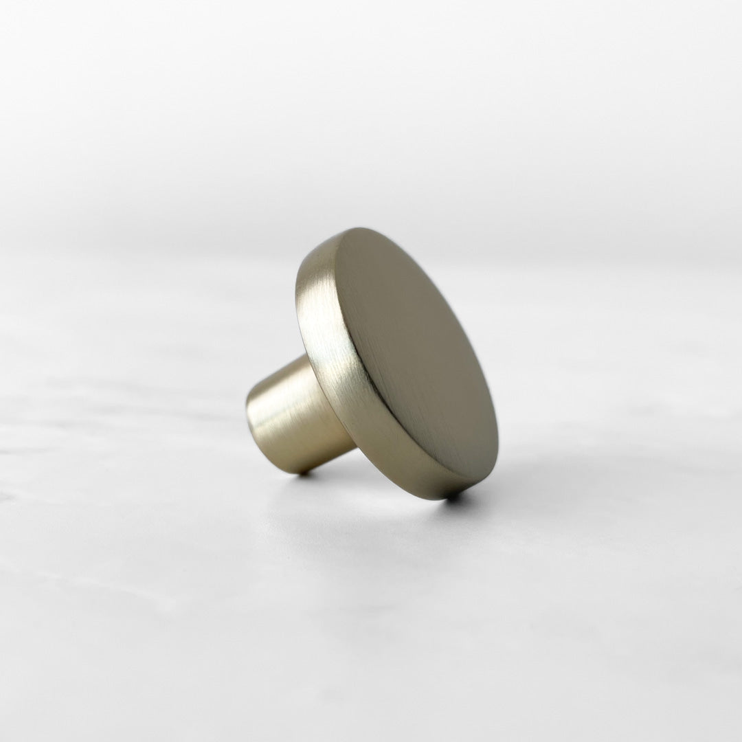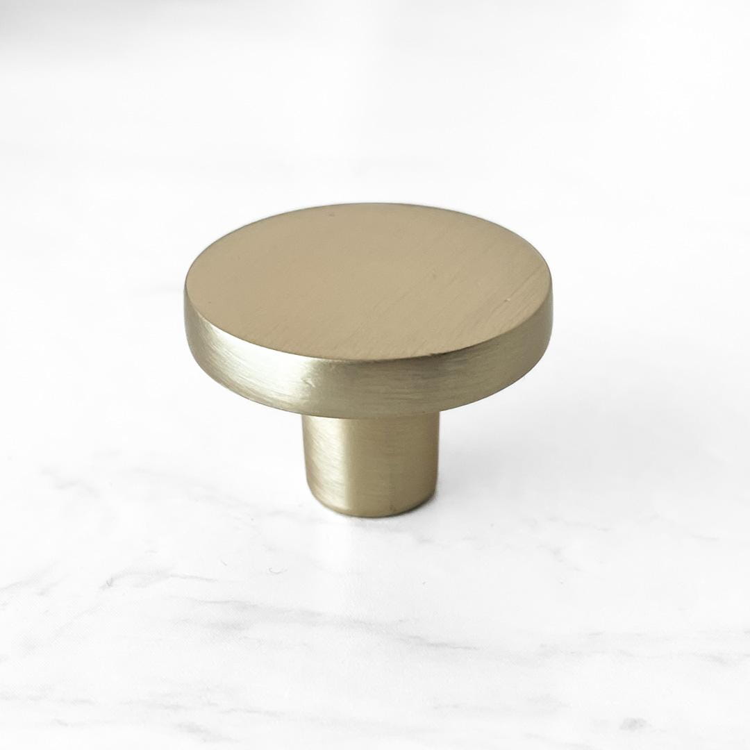 Moderne, minimalistisk knott i børstet messing. Gi nytt liv til kommoder, kjøkken, skap eller baderomsinnredning med denne flotte knotten. Bakside av knotten er avrundet for et mer behagelig grep.
