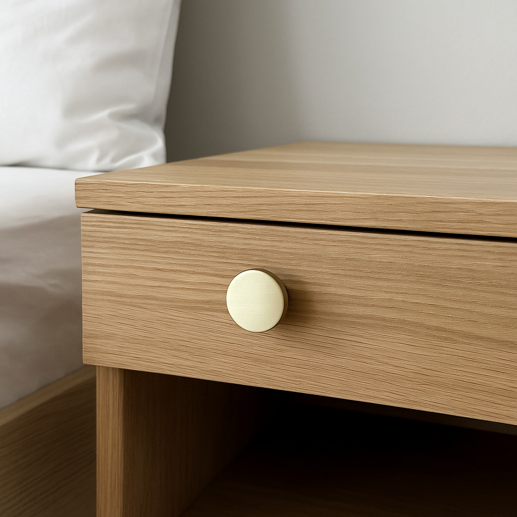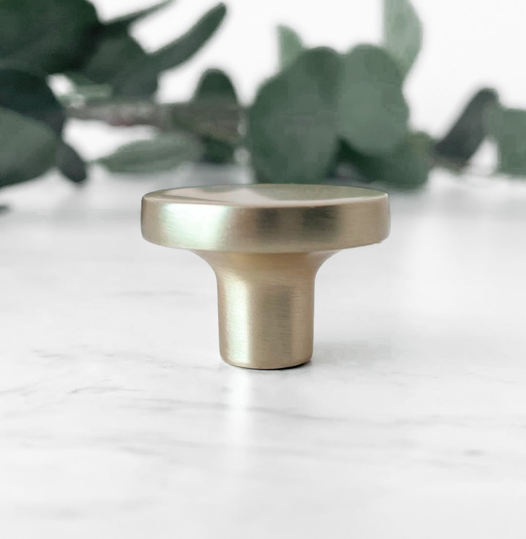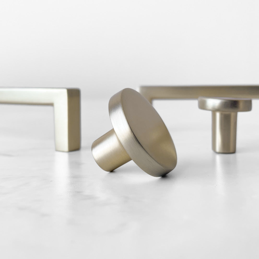 Moderne, minimalistisk knott i børstet messing. Gi nytt liv til kommoder, kjøkken, skap eller baderomsinnredning med denne flotte knotten. Bakside av knotten er avrundet for et mer behagelig grep.