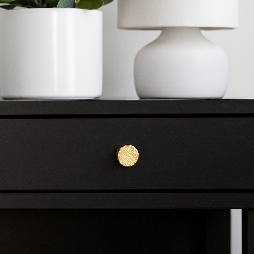 Oslo knott i gull montert på en mørk skuff, omgitt av hvite dekorative elementer som lampe og blomsterpotte i et moderne interiør.