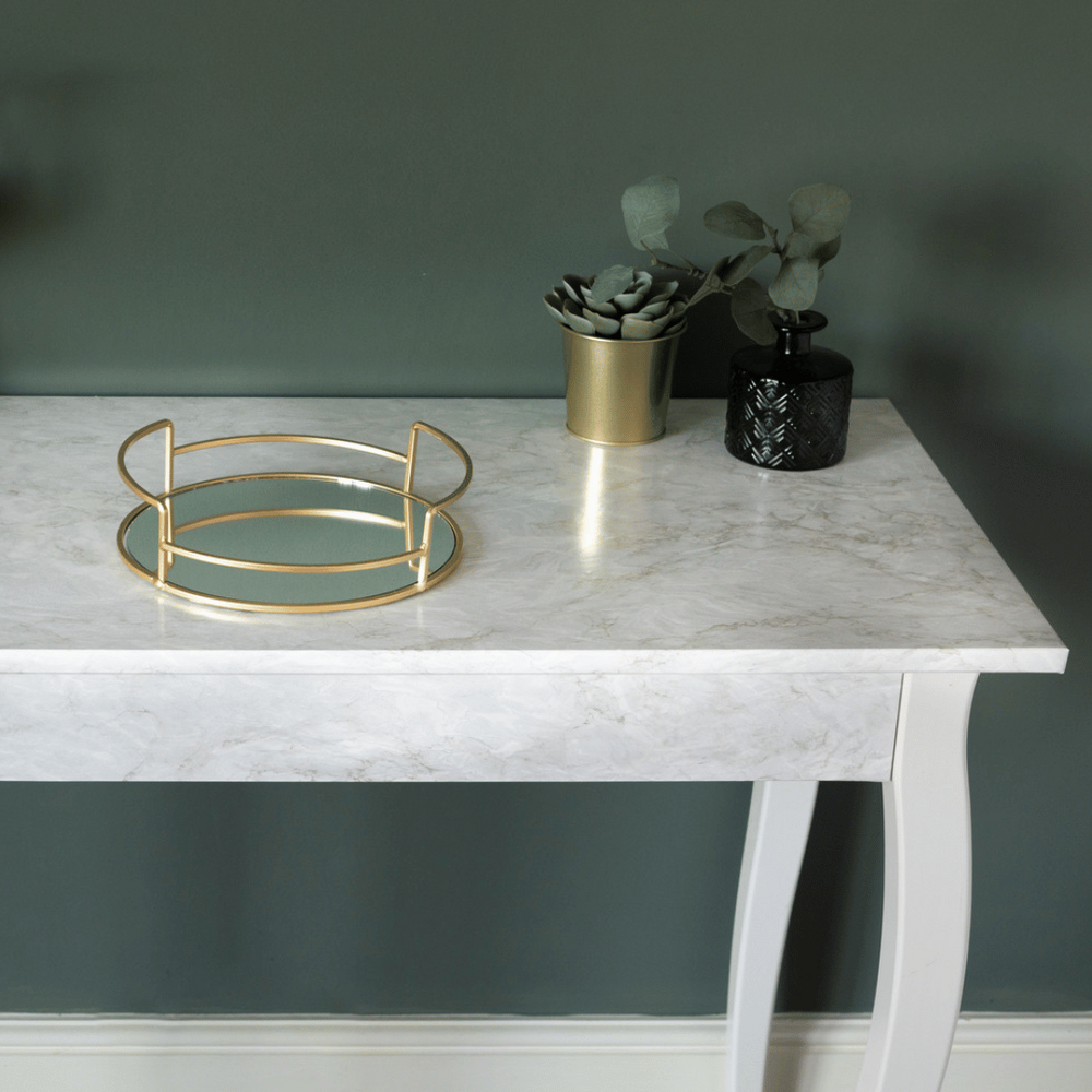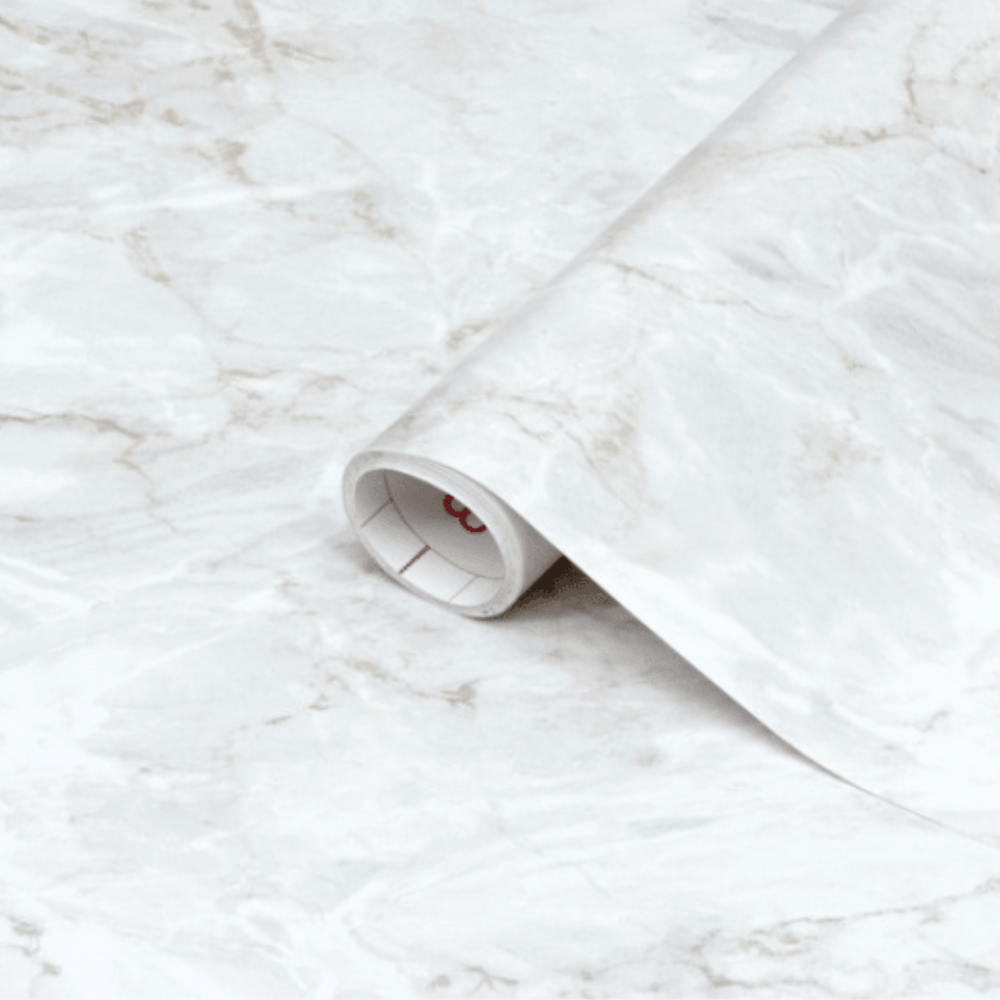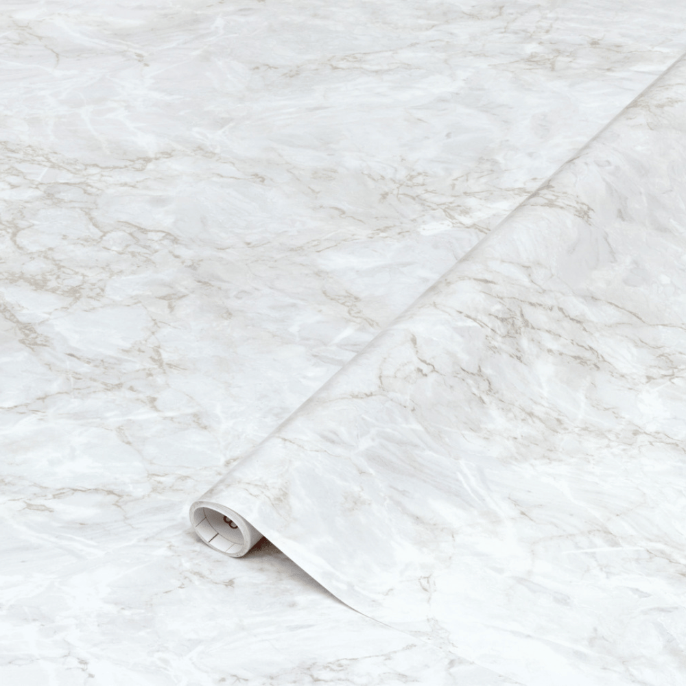 Cortes marmor gold kontaktplast har marmorutseende med en lys, nesten hvit bakgrunn og subtile årer som går gjennom mønsteret.