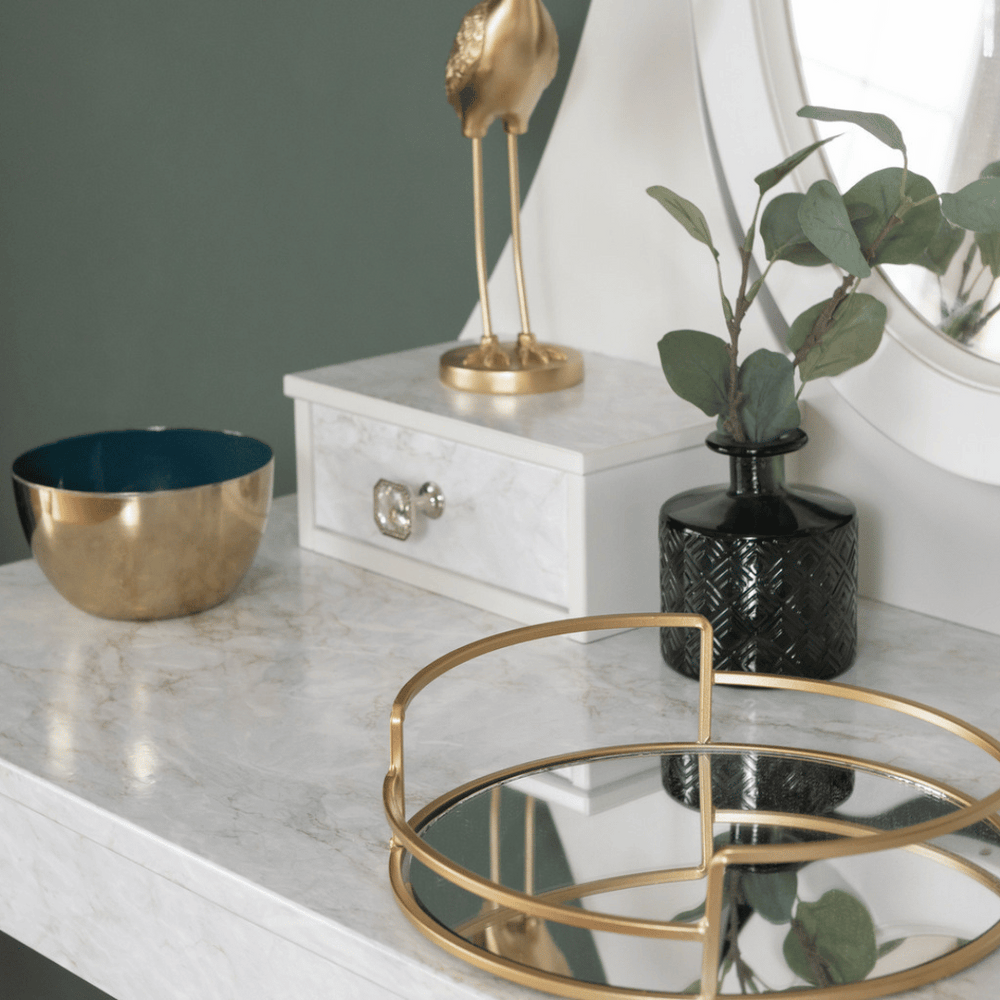 Disse beige og gullfarget årene gir en varm tone til marmoren, noe som gir et mer klassisk og mykt utseende sammenlignet med den mer kontrastfylte Carrara-marmor-stilen. Innslaget av gull reflekteres delikat i lys og oppleves ikke som overbærende.