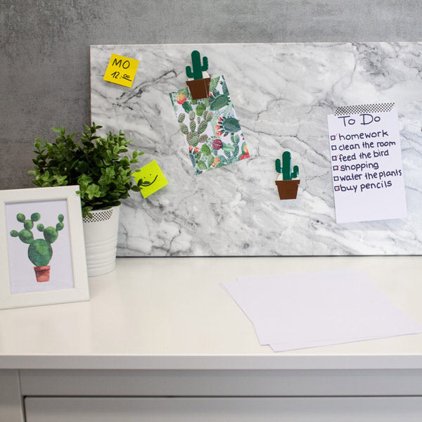 Moderne stuebord med marmormønstret kontaktplast, svart vase og kaffekopp foran beige sofa med teksturert pute og plante i bakgrunnen.