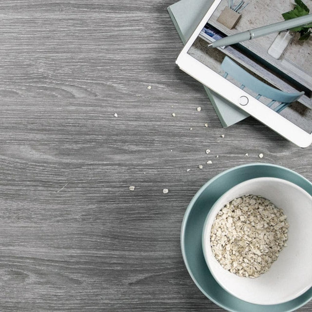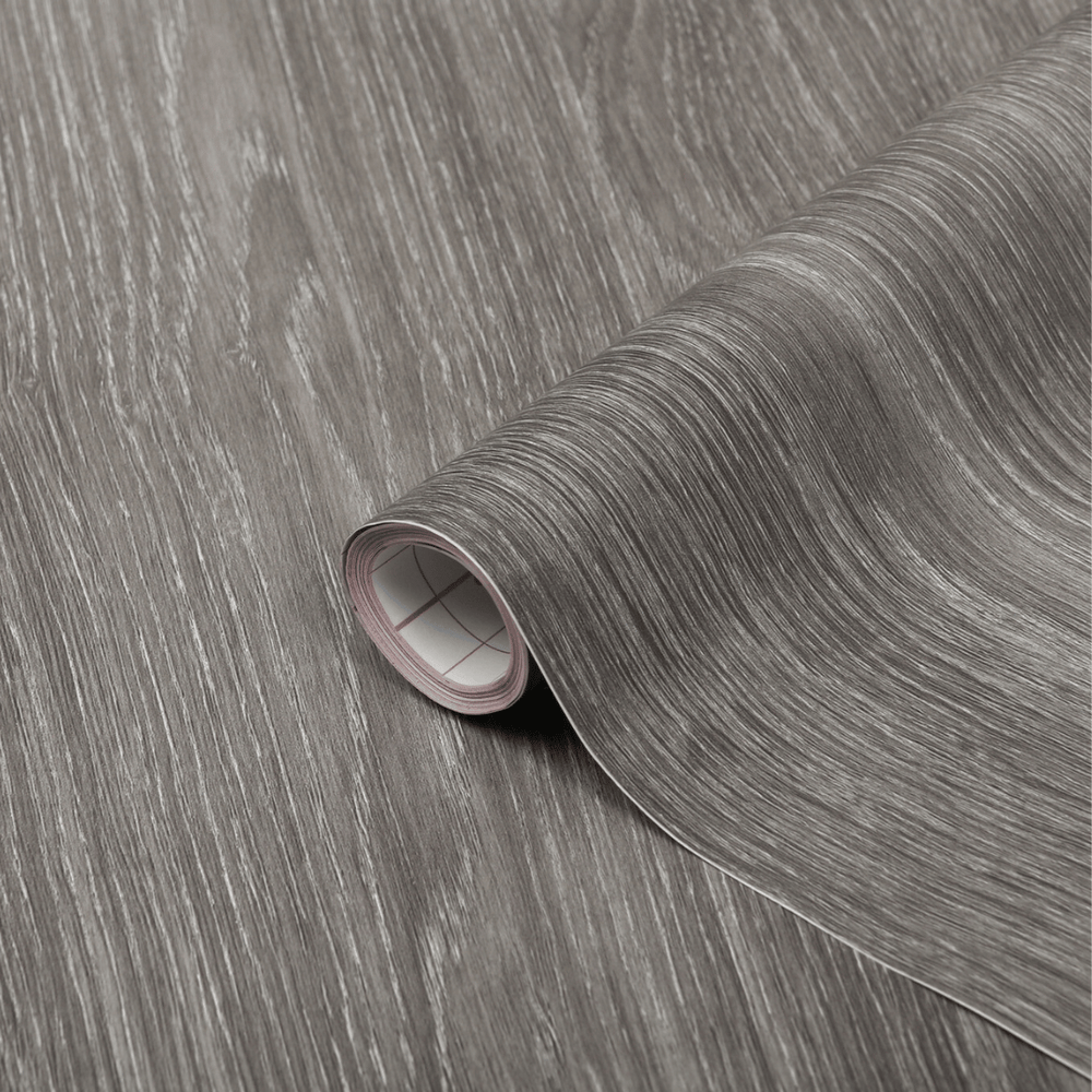 Perlegrå kontaktplast har et moderne utseende som etterligner teksturen av treverk i en gråtonet fargepalett.
