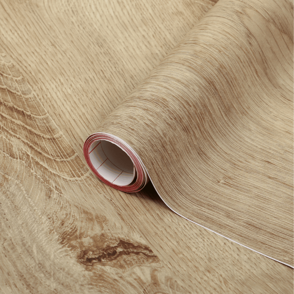 Ribbeck oak kontaktplast har en naturlig, lysebrun, varm farge med synlige årringer og knuter som gir det et autentisk og realistisk utseende.