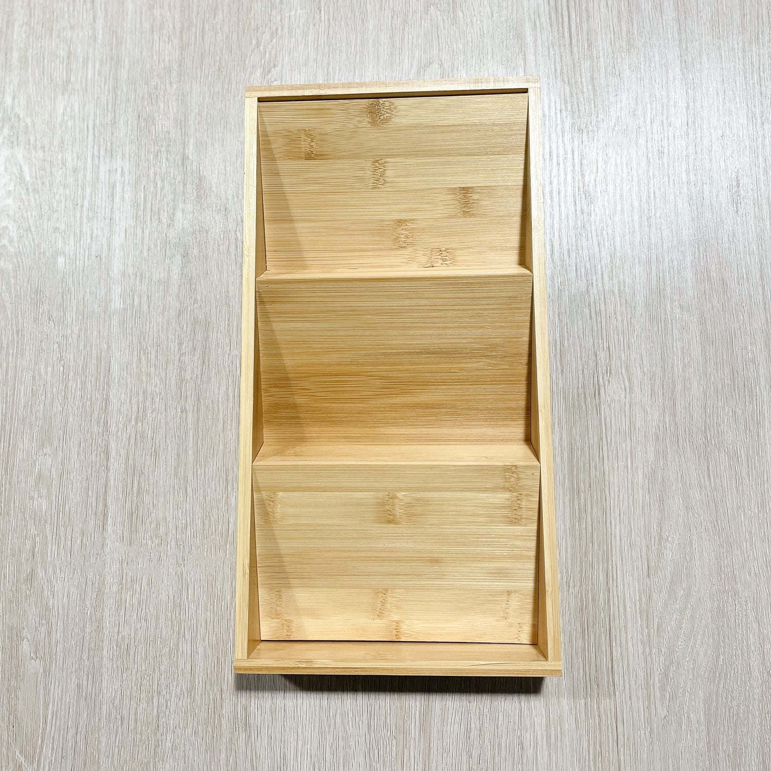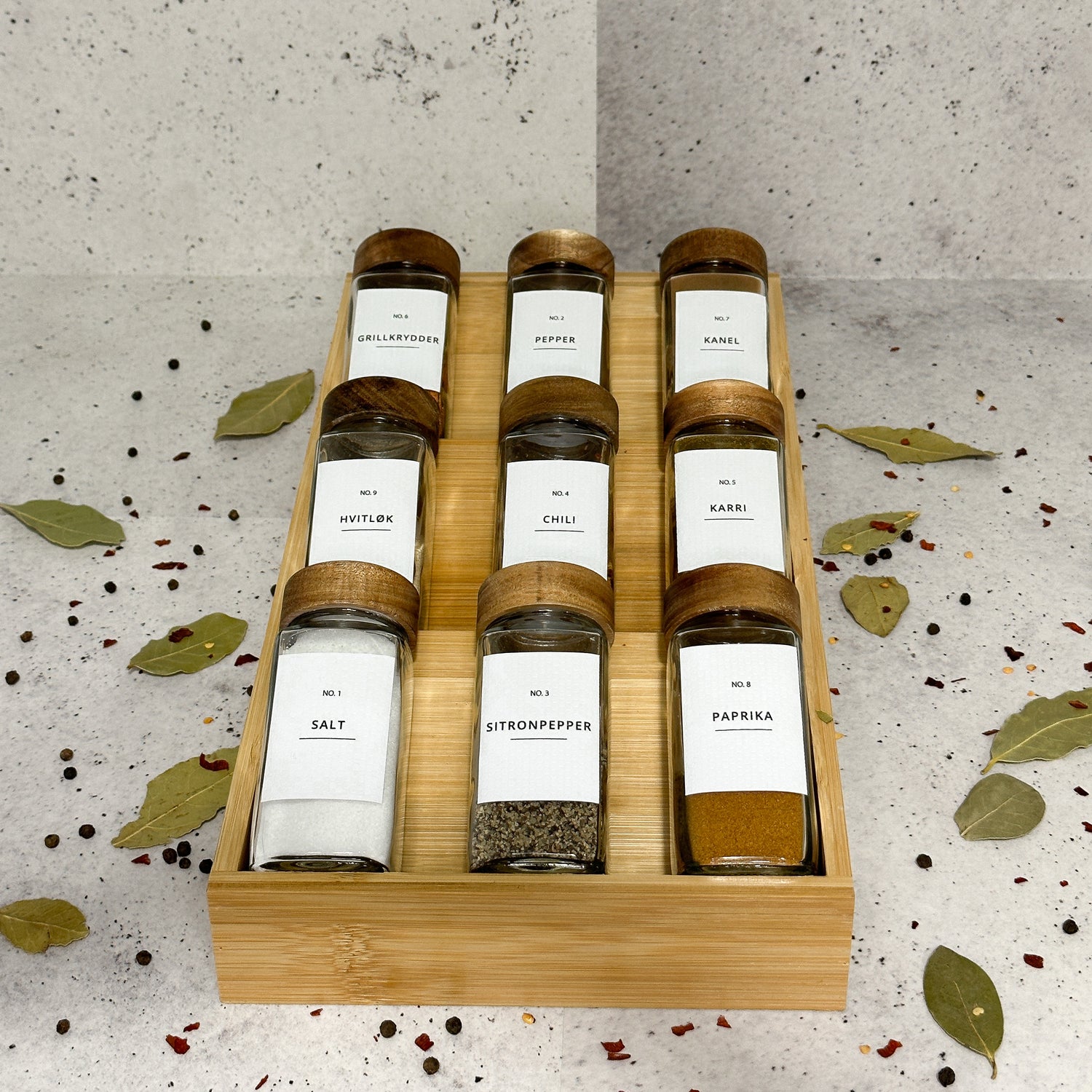 Skuffinnsats i tre til krydder. Passer perfekt i krydderskuffen eller på kjøkkenbenken som dekorasjon. Oppbevar krydderet ditt på en ryddig og stilfull måte. Skuffeinnsatsen passer til 9 stk krydderglass. Krydderglass kjøpes separat.