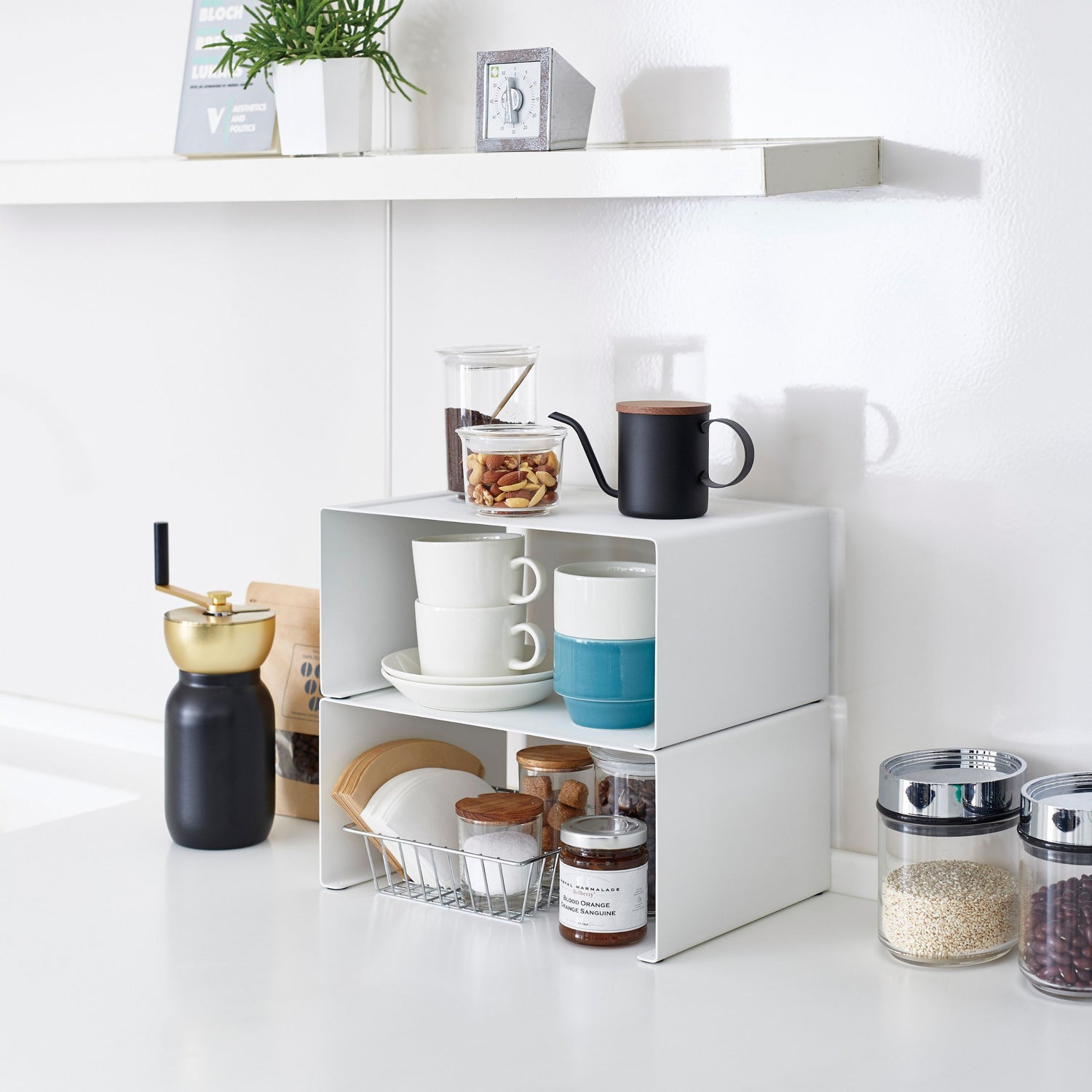 Den brede kjøkkenhyllen i hvitt er en smart oppbevaringsløsning som hjelper deg med å organisere kjøkkenbenken eller skapene dine effektivt.