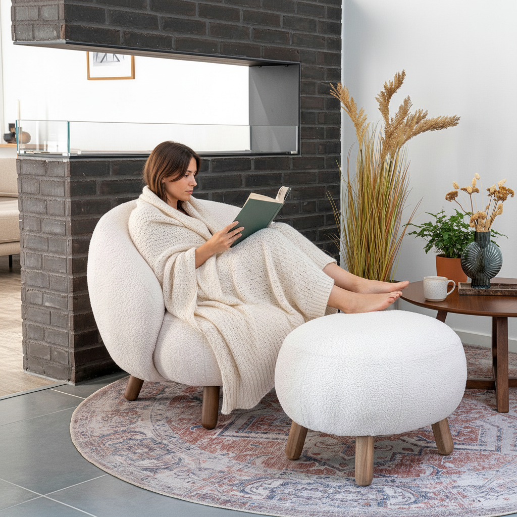 Stolen har et omsluttende formspråk som gir en god og behagelig sittefølelse, mens puffen gjør det lettere å lene seg tilbake og slappe helt av. Den hvite teddyoverflaten sammen med treben i valnøtt look gir settet et varmt og eksklusivt uttrykk. Resultatet er et stolsett som både myker opp interiøret og gir rommet en tydelig komfortsone.