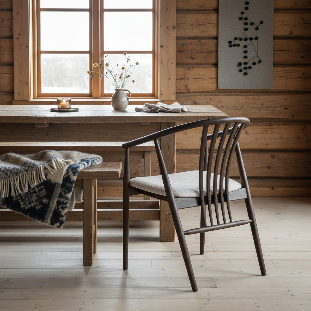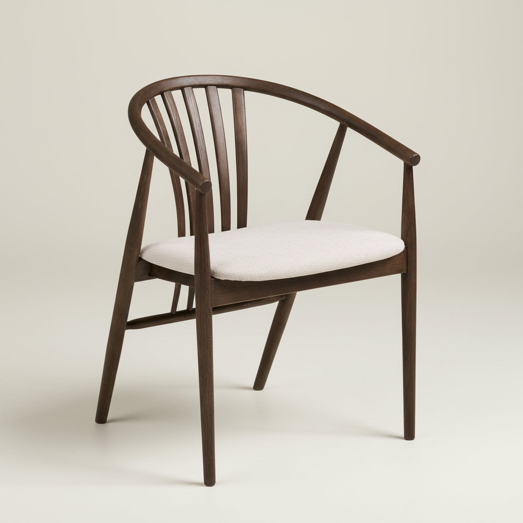 Med sine avrundede armlener og ryggstøtte gir Agustin en god sitteopplevelse – perfekt til lange middager og hyggelige sammenkomster. Den varme, røkte eikefargen skaper en lun atmosfære, mens det sandfargede trekket tilfører et moderne og lyst preg som passer inn i de fleste hjem.