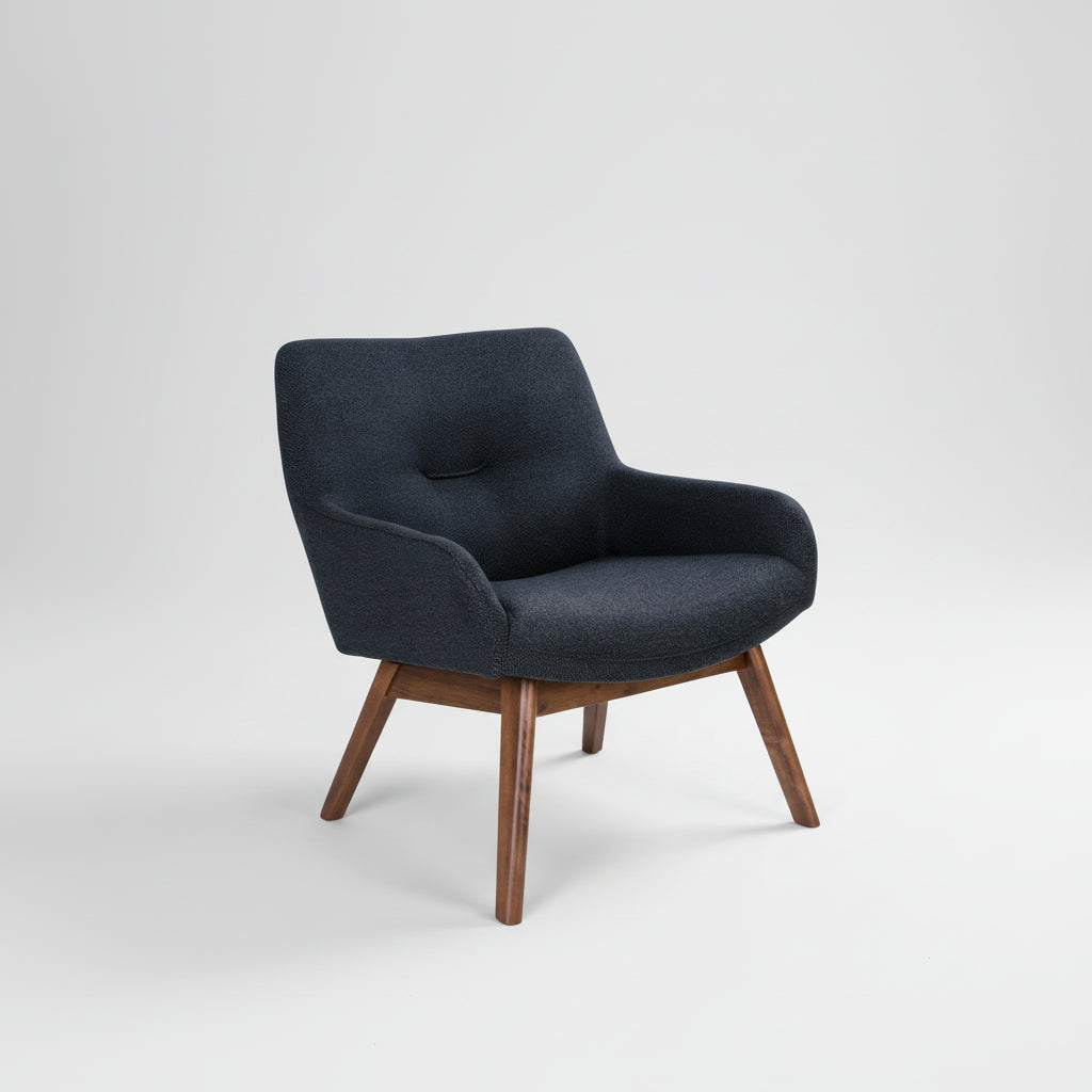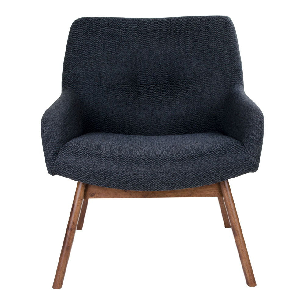 Skap en elegant atmosfære i hjemmet med London Lounge stol i mørk blå med valnøtt farget ben. Denne stolen kombinerer moderne komfort med klassiske detaljer.