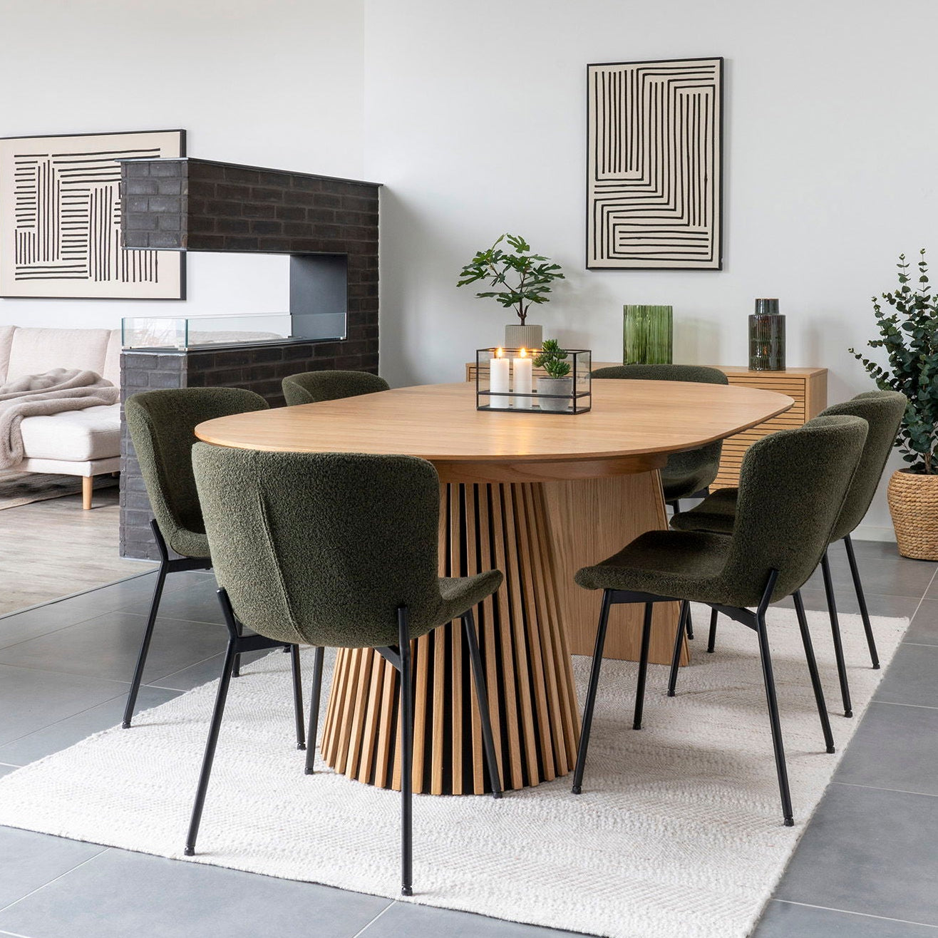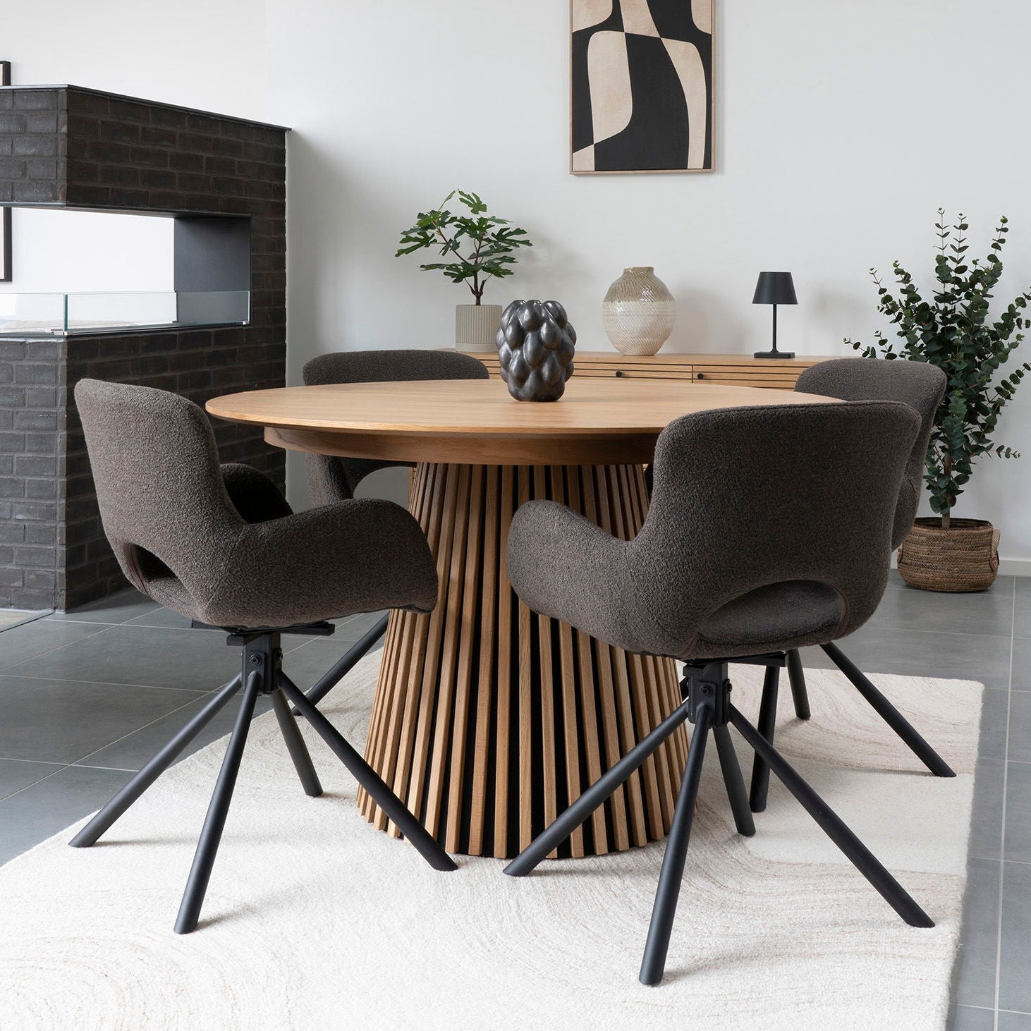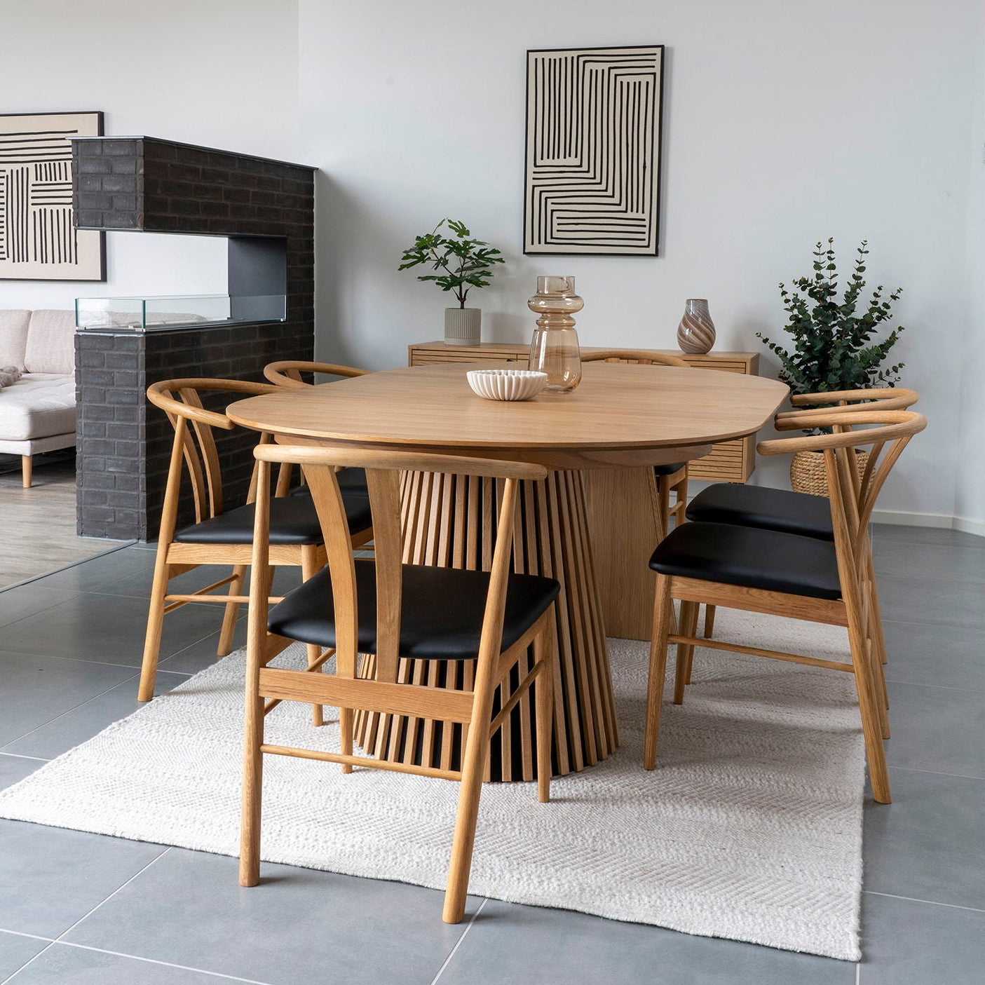 Osaka spisebord i natur eikefiner kombinerer praktiske løsninger med et moderne designuttrykk. Den runde formen gjør det enkelt å plassere bordet i både små og store rom, og gir en behagelig samtaleplass for alle rundt bordet.