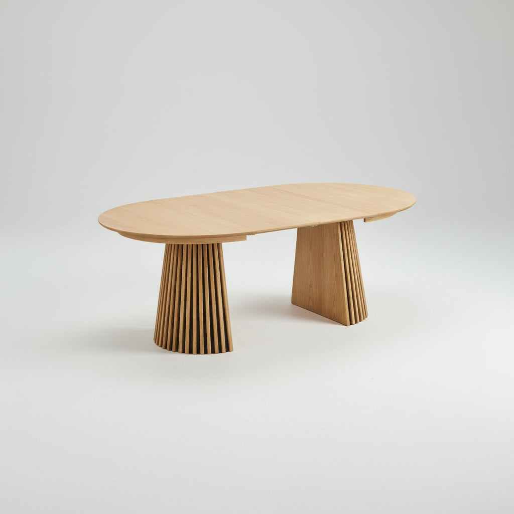 Bordet leveres med to innleggsplater som gjør det mulig å tilpasse størrelsen til anledningen. Start med en diameter på 120 cm for daglig bruk, og utvid til 160 eller 200 cm når du får gjester. Dette gjør bordet fleksibelt og perfekt for hjem hvor det skjer litt av hvert.
