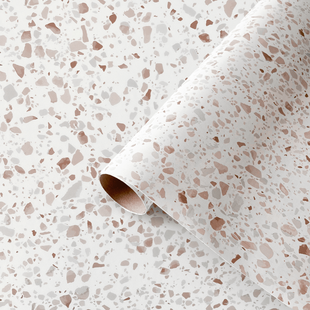 Tykkere, unik kontaktplast med selvklebende bakside. Denne nydelige folien etterligner terrazzo i dempet beige og bruntoner på en lys bakgrunn. Denne er råfin på kjøkkenvegg, benkeplate eller på toppen av en bordplate.