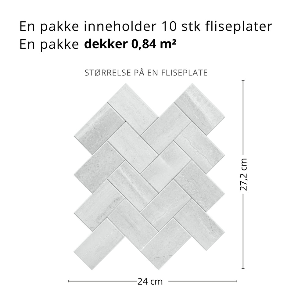 Vilde selvklebende fliser gir en tidløs oppgradering til ethvert rom. Med et klassisk fiskebensmønster i lysegrå steinstruktur skaper de en elegant og moderne overflate.