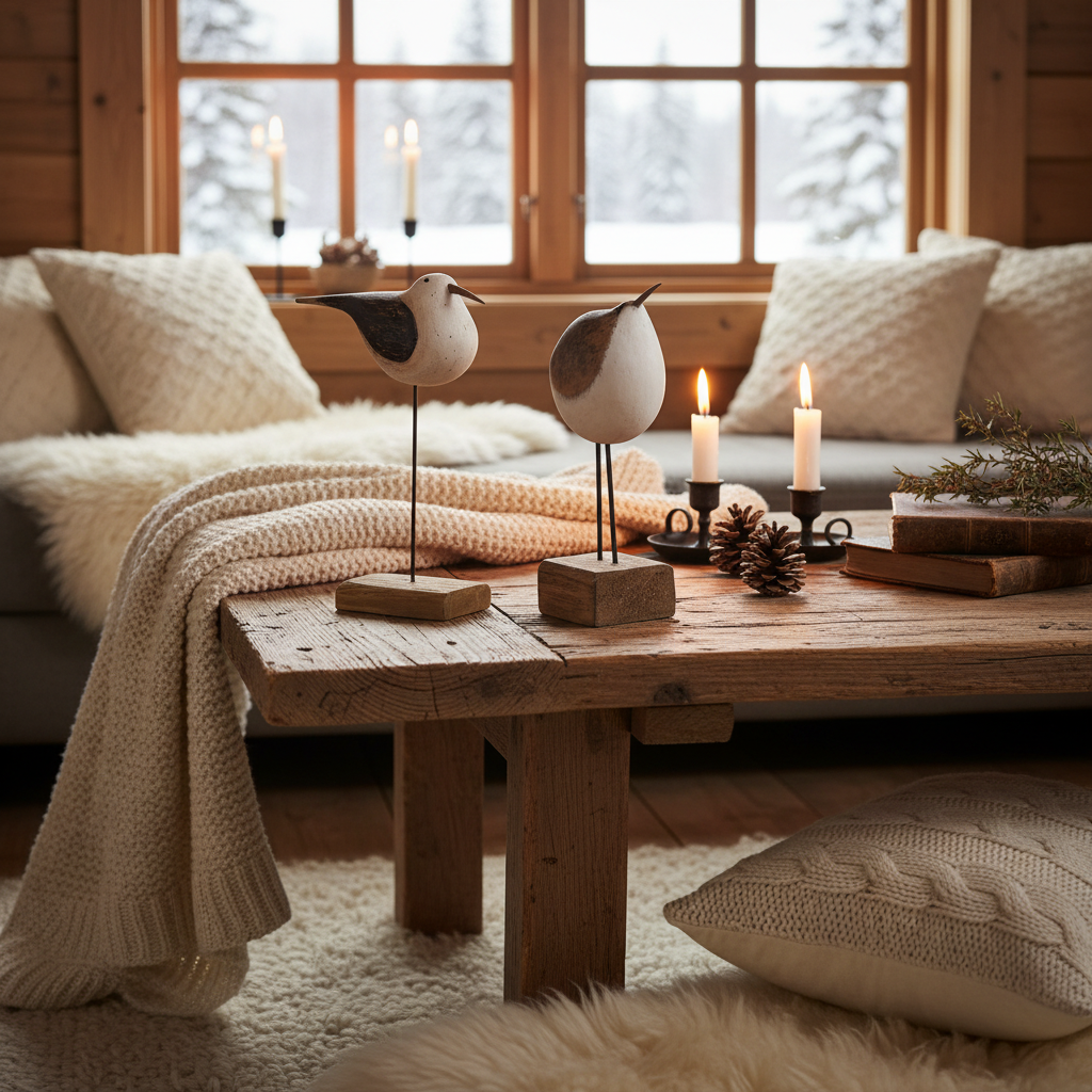 Skap en rolig og gjennomført stil med dette dekorative pakke settet med to fuglefigurer i tre. Kombinasjonen av en maritim måke på fot og en stilren liten dekorfugl gir hjemmet et naturlig nordisk uttrykk med hint av kystidyll.