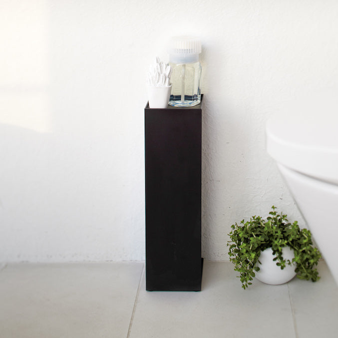 Gi badet et ryddig med vår diskré dorullholder til gulv i sort metall. Denne elegante oppbevaringsboksen skjuler toalettruller eller andre baderomsartikler, og passer perfekt til både små og store baderom.