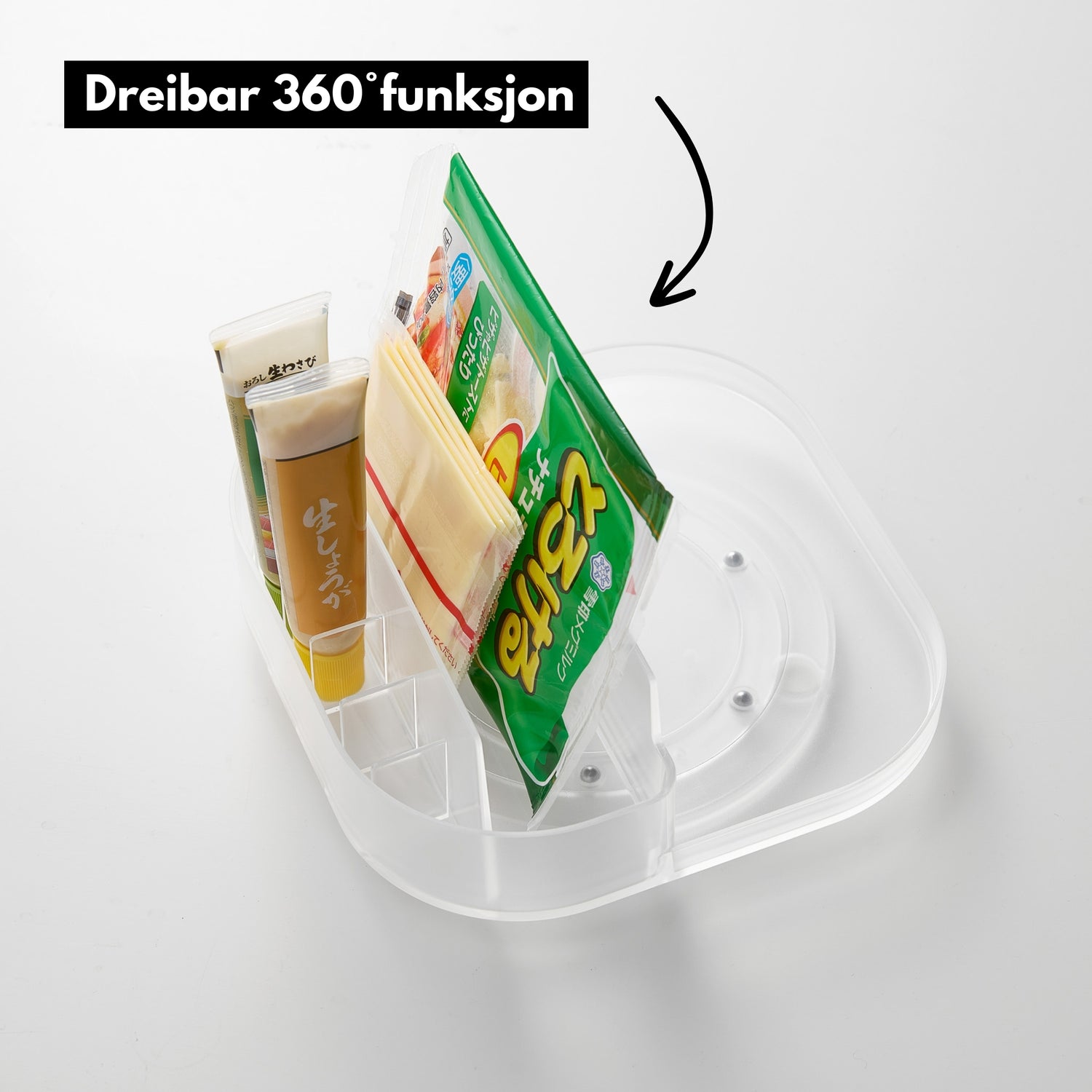 360° roterende snurrebrett med soneinndeling for effektiv organisering av matvarer, baderomsartikler eller vaskemidler.