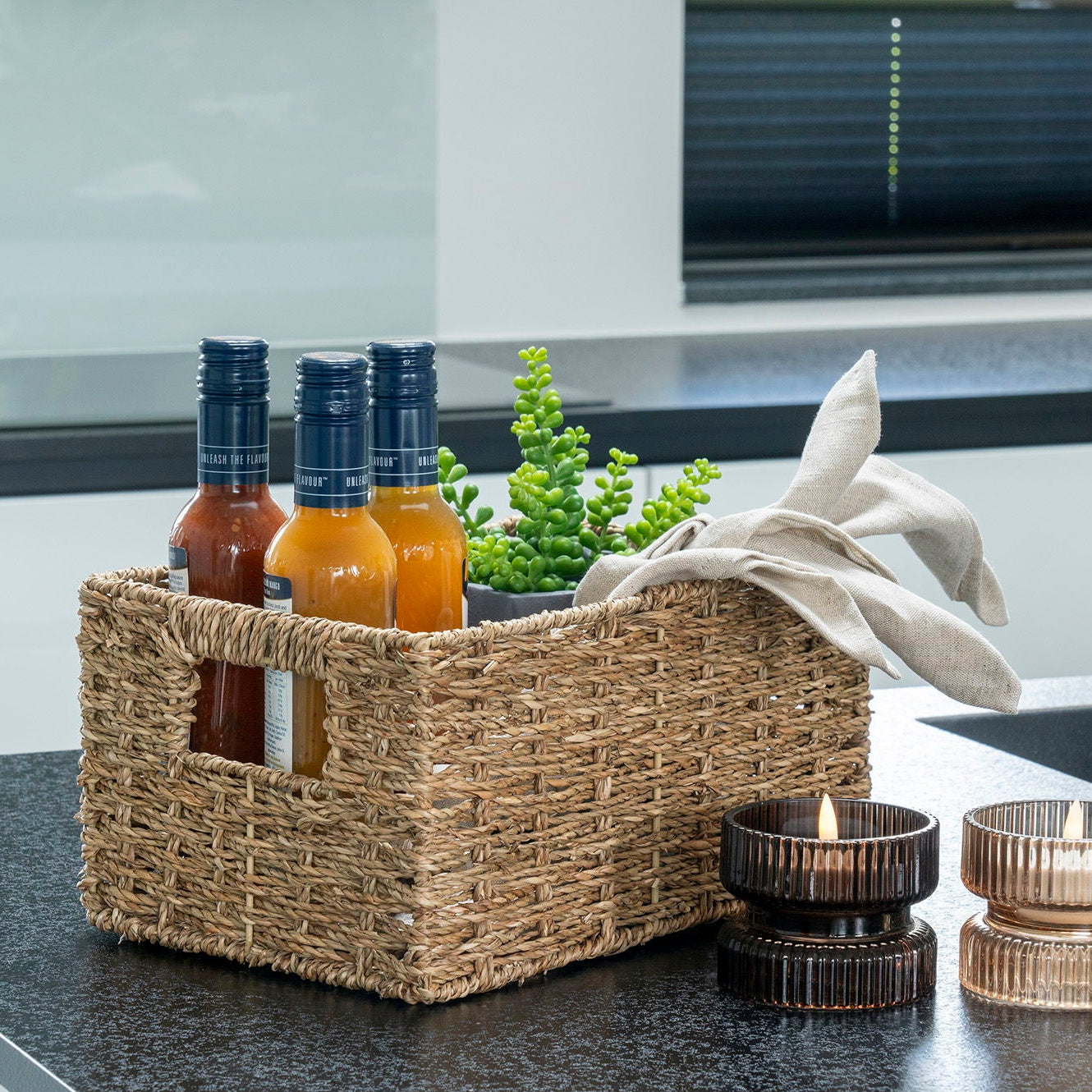 Venoso oppbevaringskurver er et stilrent og praktisk sett med to rektangulære kurver i naturfarget flett. Kurvene er laget av slitesterke naturmaterialer og har integrerte håndtak som gjør dem enkle å løfte og flytte. Perfekte til oppbevaring av småting på badet, i stuen, på kjøkkenet eller i hyller.