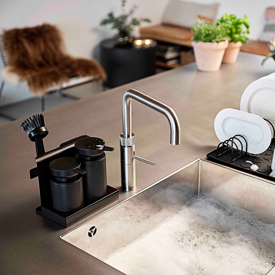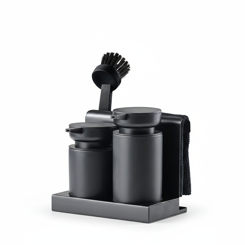 Settet består av keramiske dispensere, metallstativ og integrert brett som samler såpe, børste og klut på ett sted. Den sorte overflaten gir et helhetlig og ryddig uttrykk ved kjøkkenvasken, samtidig som brettet samler opp overflødig vann.