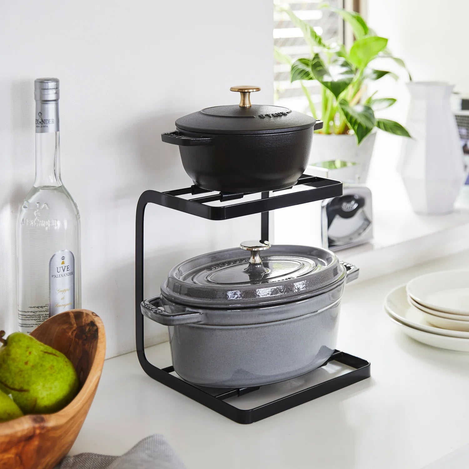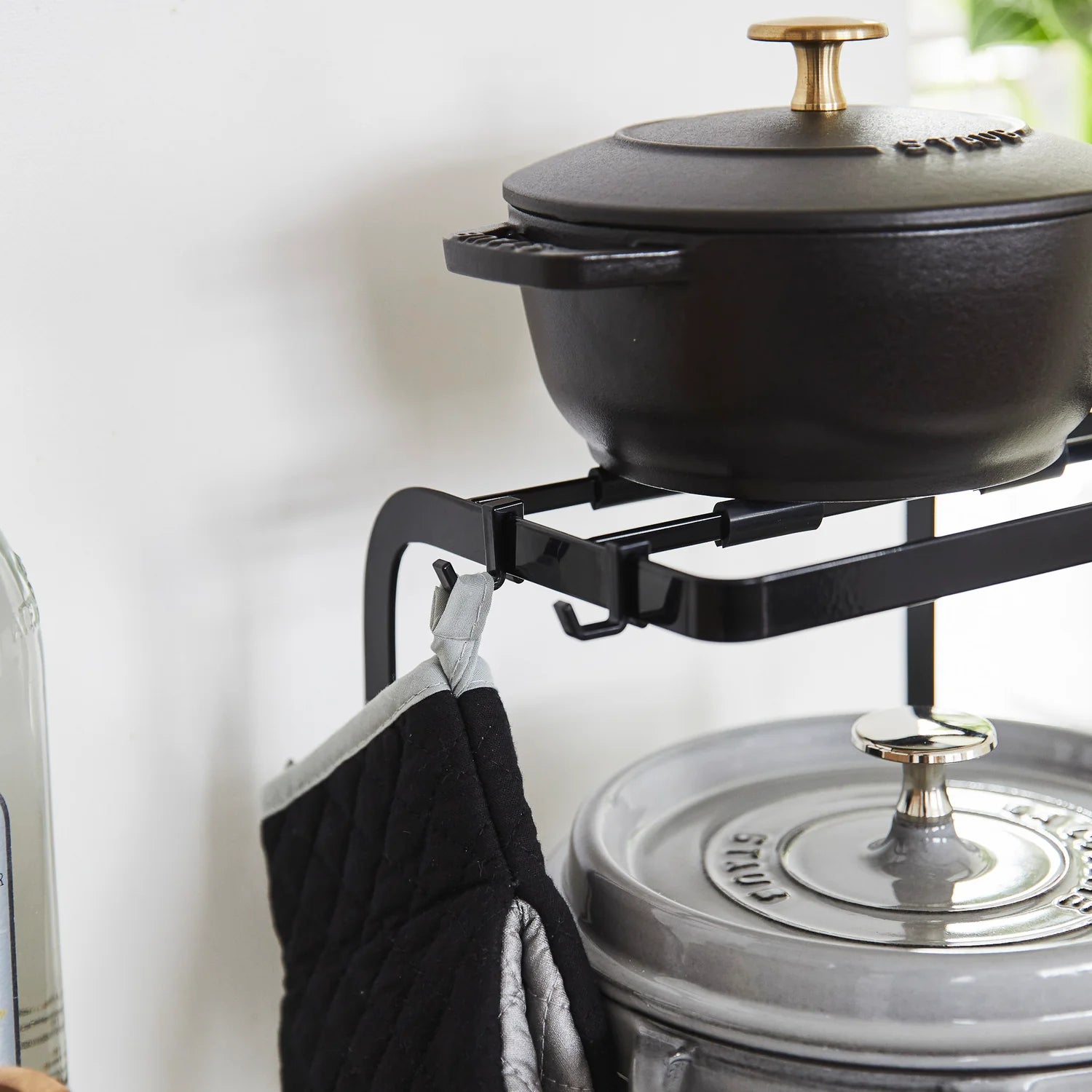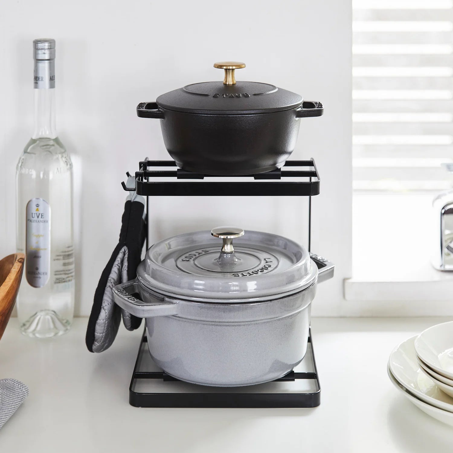 Få bedre oversikt over gryter, lokk og kjøkkenutstyr med et praktisk grytestativ som utnytter høyden i skapet eller på kjøkkenbenken. Denne sorte modellen gjør det enklere å stable smartere, frigjøre plass og holde det du bruker ofte lett tilgjengelig.
