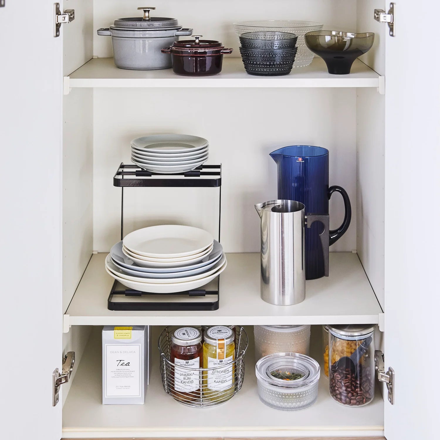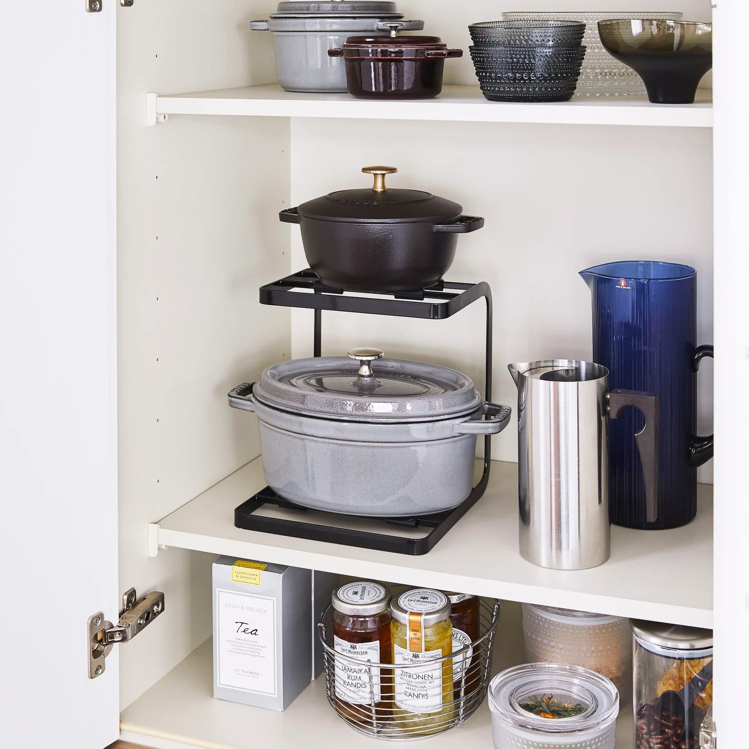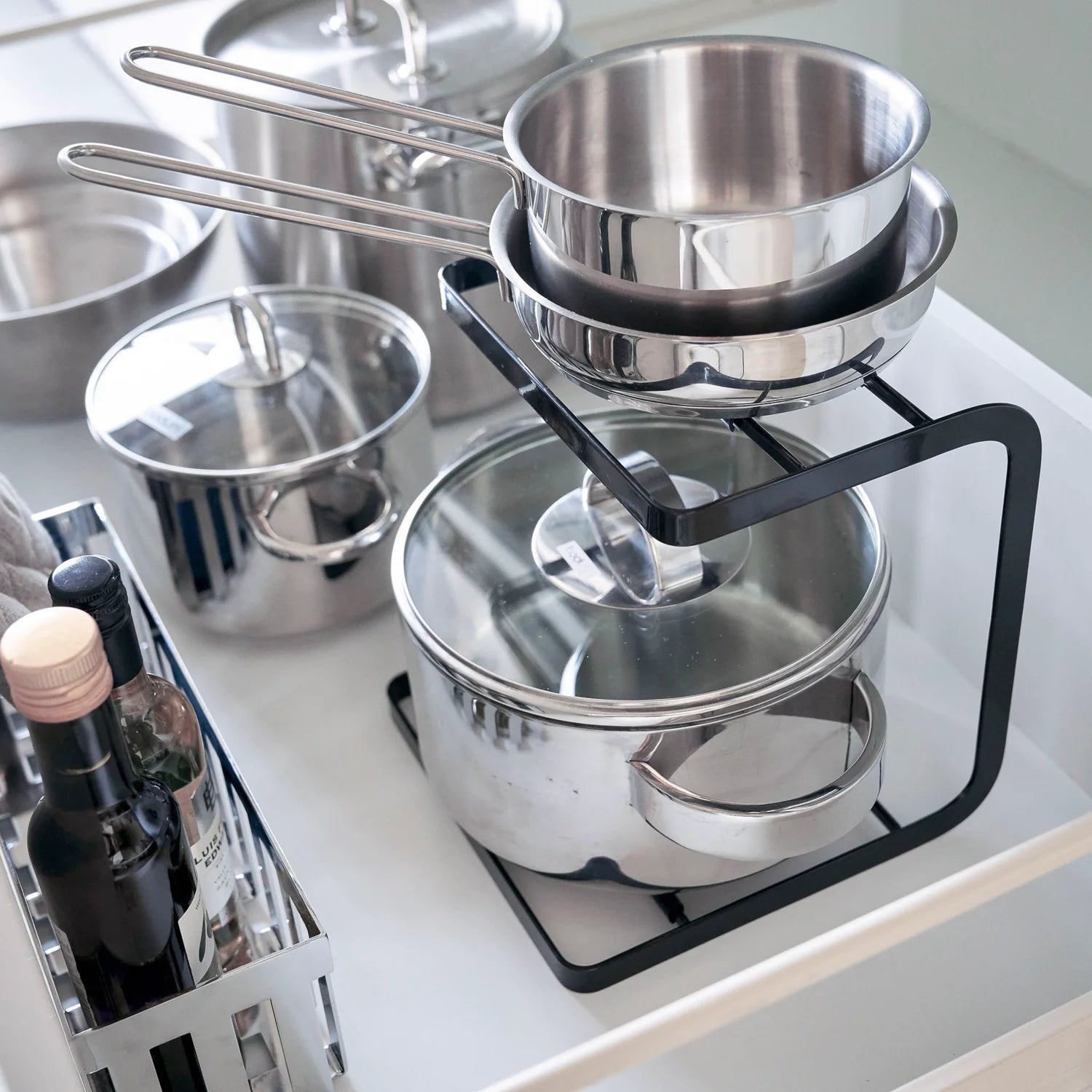 Få bedre oversikt over gryter, lokk og kjøkkenutstyr med et praktisk grytestativ som utnytter høyden i skapet eller på kjøkkenbenken. Denne sorte modellen gjør det enklere å stable smartere, frigjøre plass og holde det du bruker ofte lett tilgjengelig.