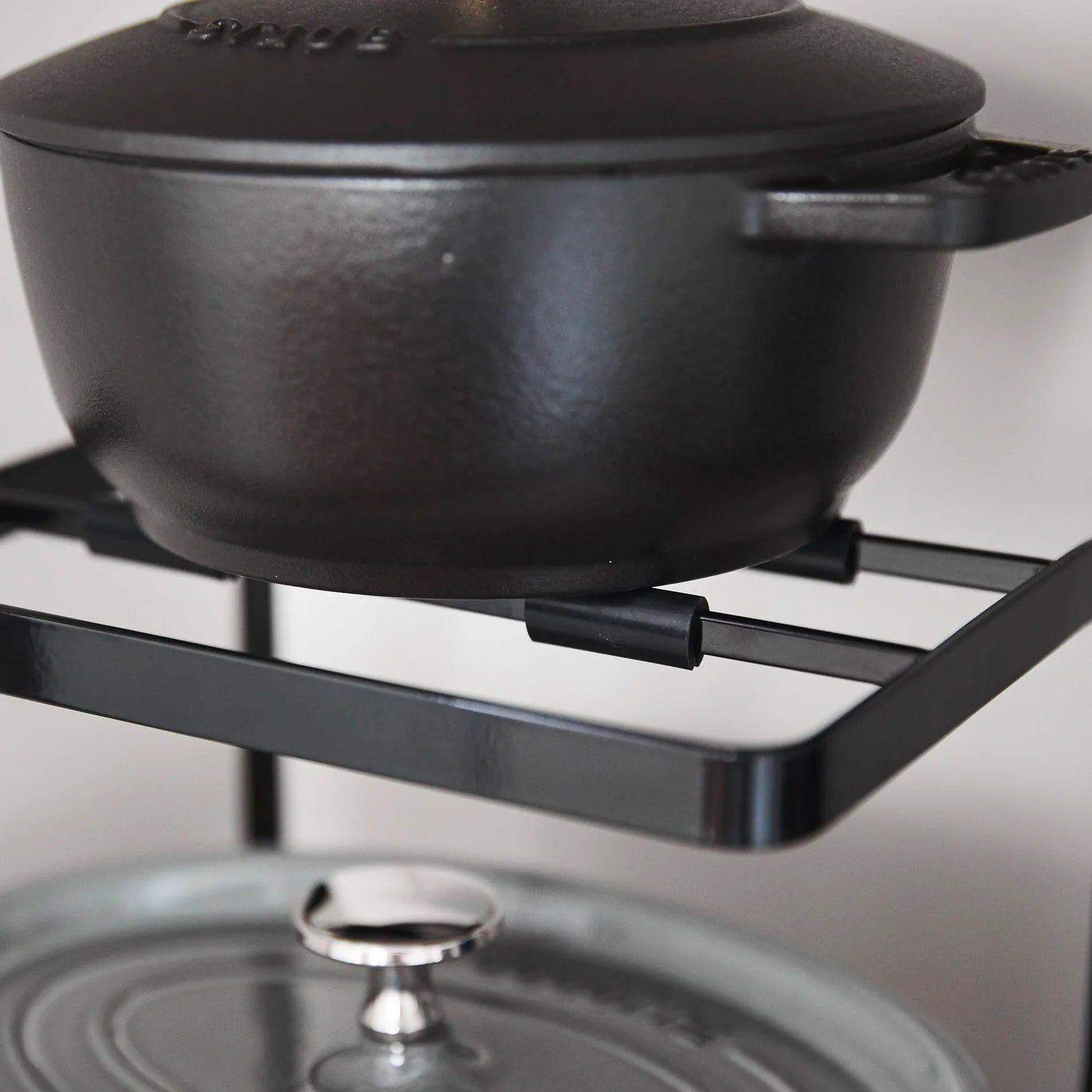 Svart grytestativ med 2 nivåer til oppbevaring av gryter og lokk