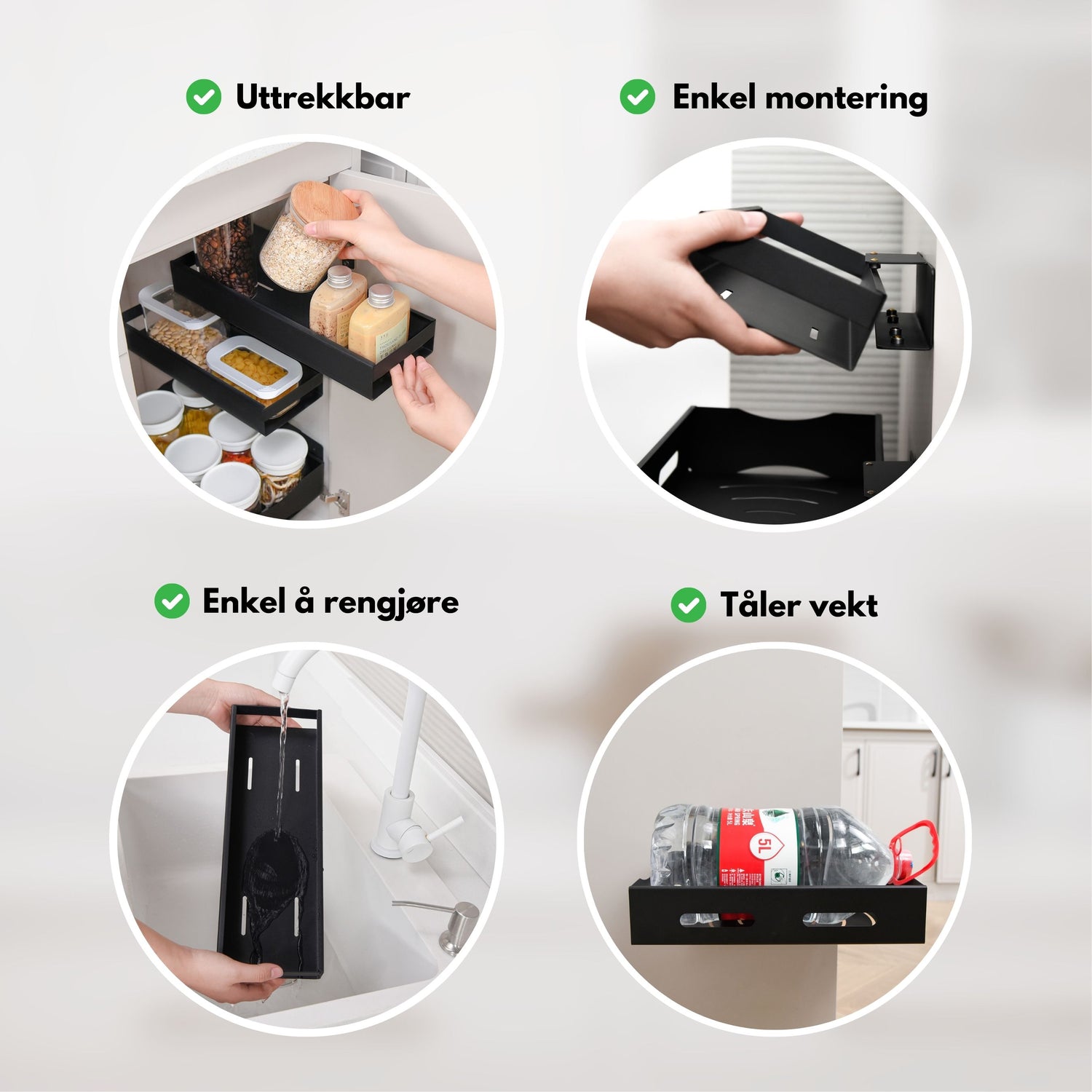 Med denne 2-pakken får du en smal og en medium uttrekkbar hylle som gjør det enklere å holde orden og få rask tilgang til innholdet i skap. Hyllene kan monteres i kjøkkenskap, under vasken eller på siden av innredning, og passer like godt til matvarer og krydder som til rengjøringsmidler og baderomsprodukter. Dra hyllen ut når du trenger noe, og få full oversikt uten å flytte på alt.