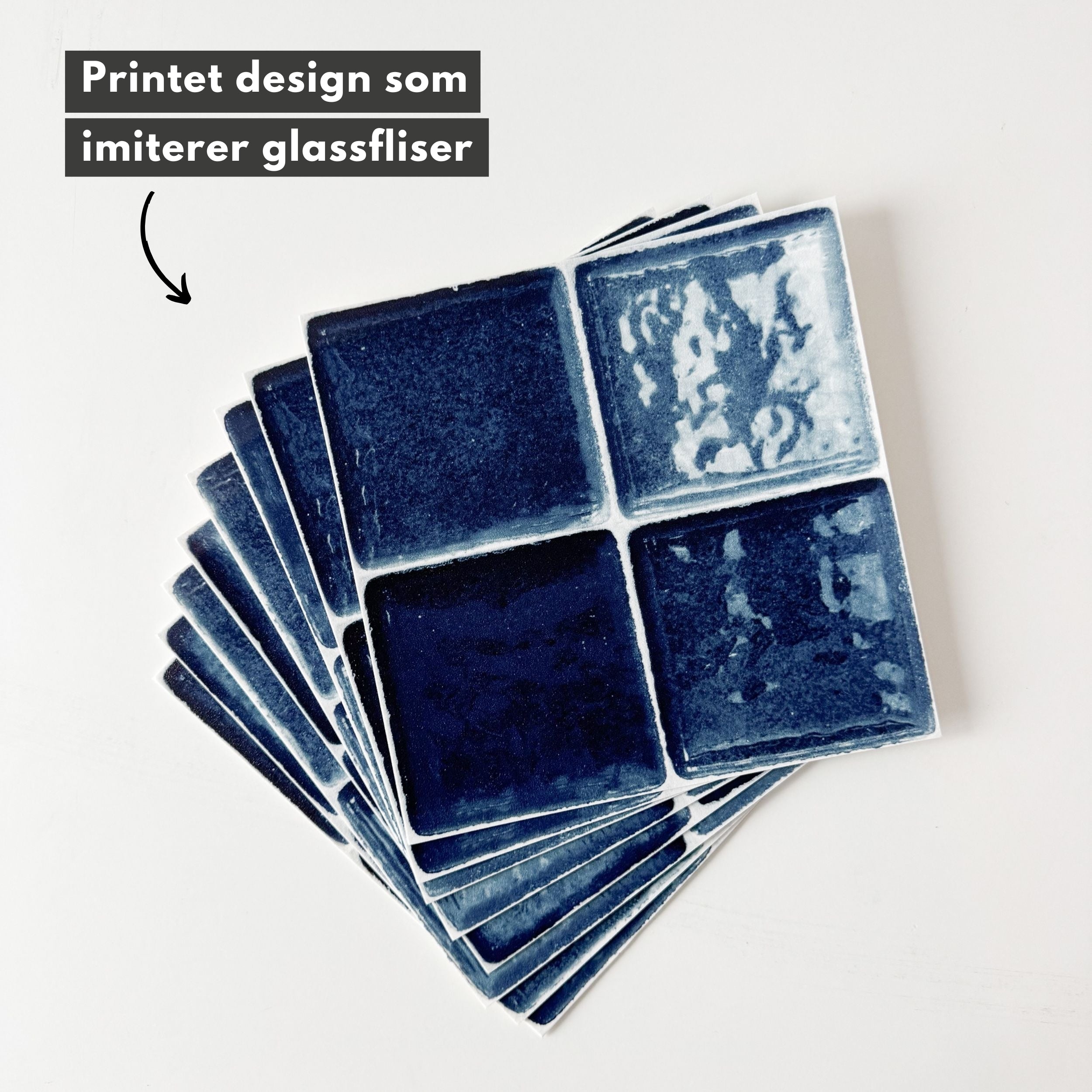 Ezra dyp blå selvklebende fliser imiterer kvadratiske glassfliser i en dyp blå farge. Pakken består av 8 fliser med 2 variasjoner som gjør at du får et naturlig resultat når flisene monteres.