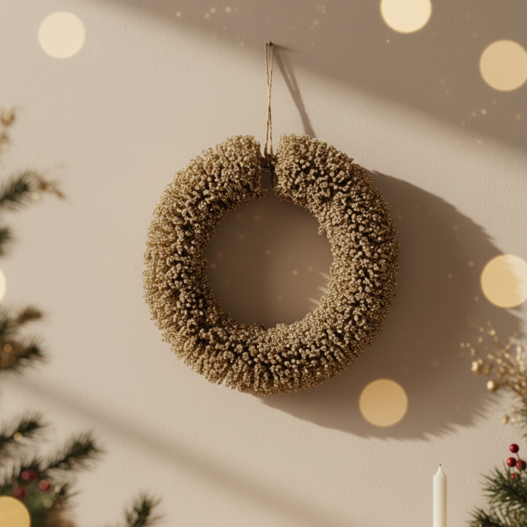 Gi hjemmet ditt et luksuriøst og elegant uttrykk denne julen med vår vakre gullfargede krans i metalltråd. Med sin glitrende gullfinish og diameter på 40 cm blir denne kransen et umiddelbart blikkfang som løfter juledekorasjonen din til et nytt nivå.