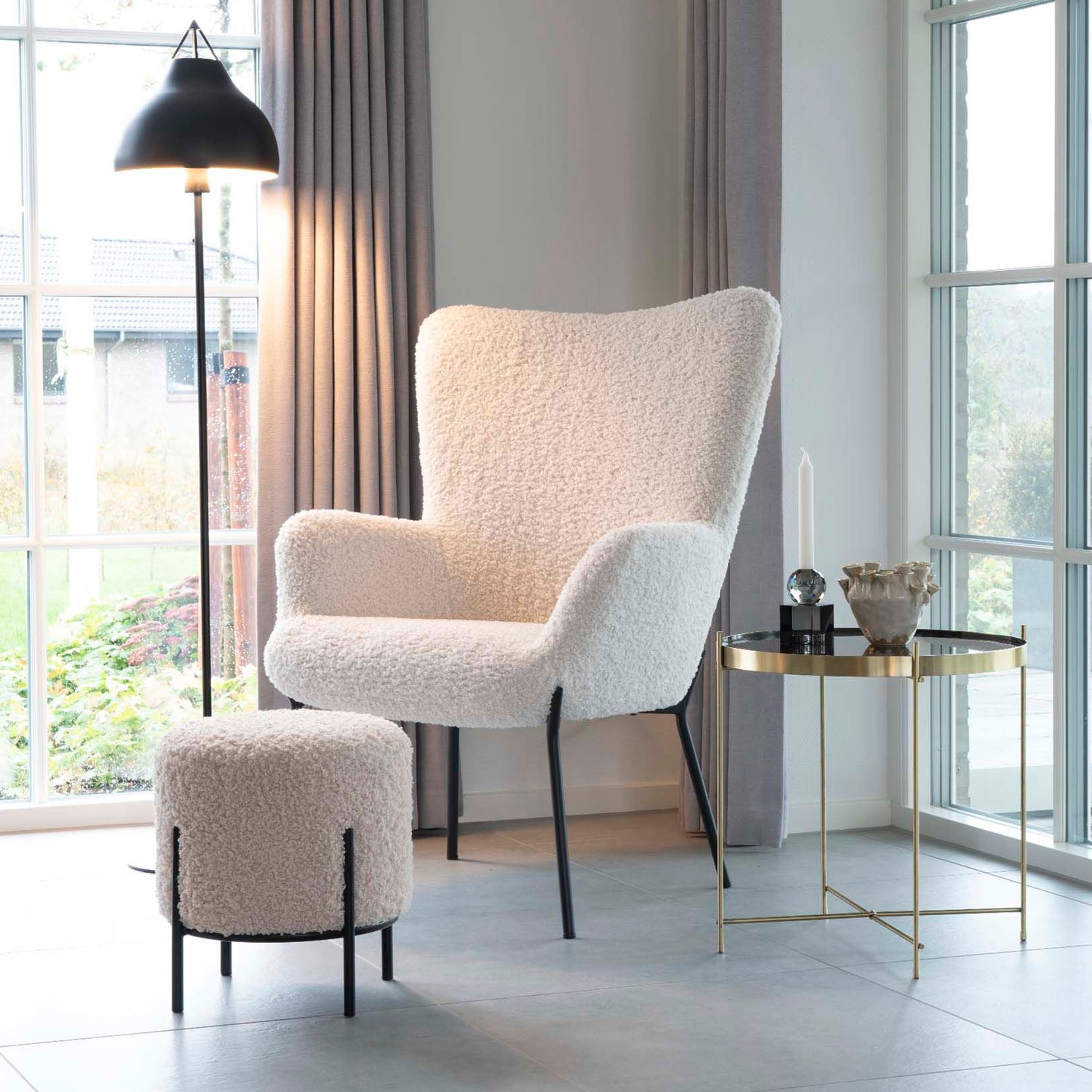 Den runde formen kombinert med den lyse teddyoverflaten gir et lett og harmonisk uttrykk, mens sorte metallben gir en tydelig kontrast som løfter helheten og gjør puffen mer moderne. Resultatet er et møbel som både føles mykt og ser gjennomført ut.