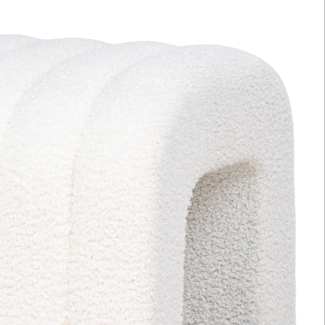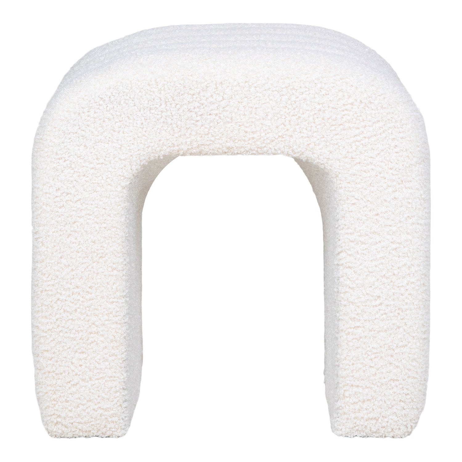 Den buede utformingen gir et mer spennende visuelt uttrykk enn en tradisjonell puff, samtidig som boucléstoffet tilfører en lun og behagelig følelse. Den åpne formen gjør den både dekorativ og funksjonell som sitteplass eller liten avlastning i rommet.