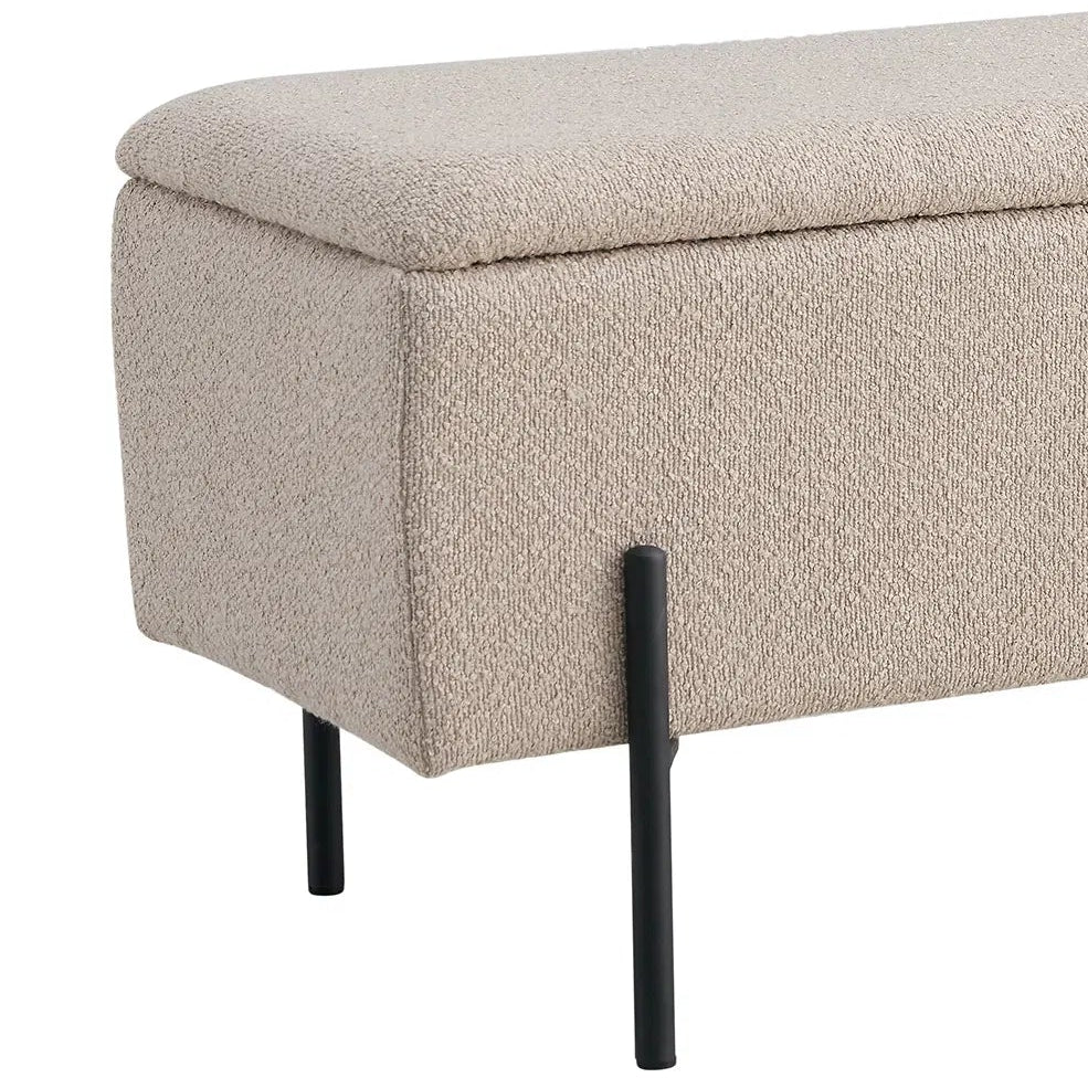 Setet kan åpnes og gir deg praktisk oppbevaringsplass til pledd, puter, sko eller småting du vil holde ute av syne. Den solide konstruksjonen og slitesterke tekstilen gjør at benken fungerer like godt i hverdagen som i rom hvor du ønsker ekstra sitteplasser.