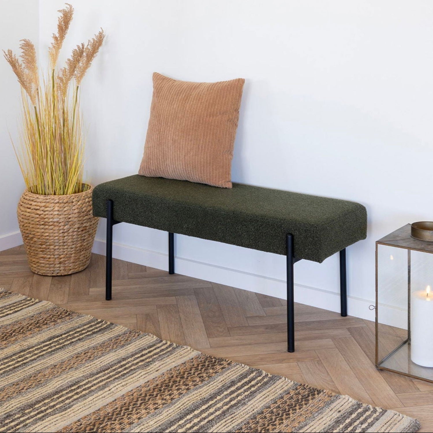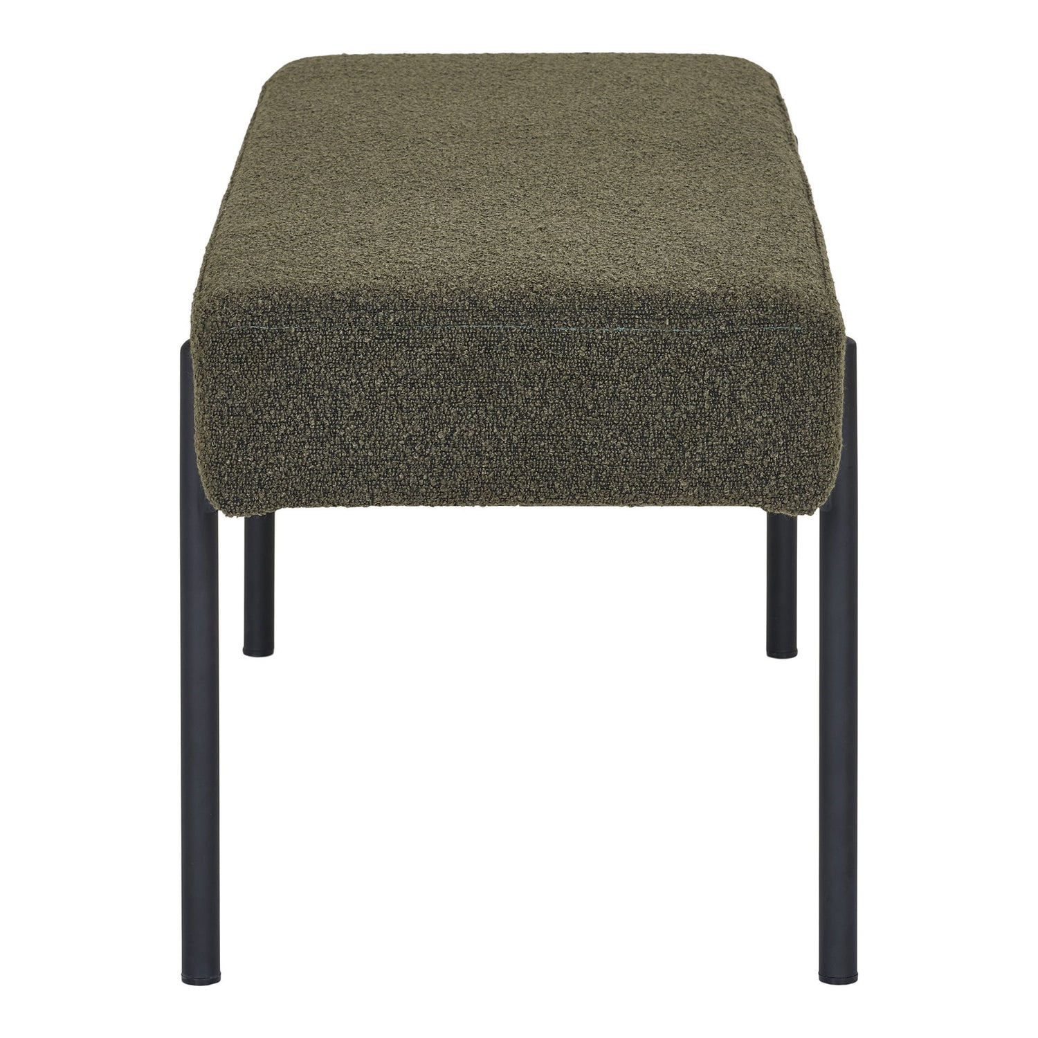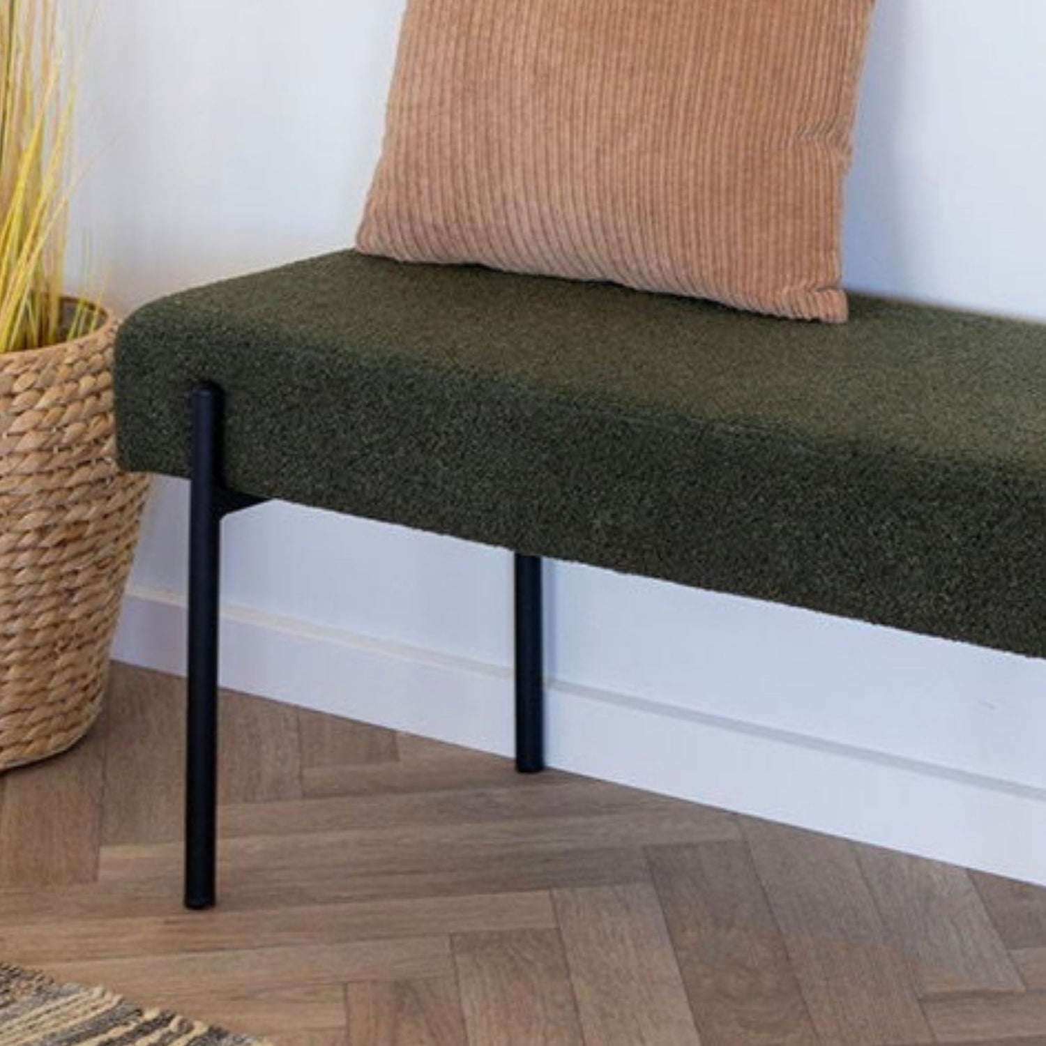 Den myke bouclé tekstilen i mørk grønn gir møbelet en dyp og varm fargetone, mens de slanke sorte metallbena skaper en luftig kontrast. Resultatet er en benk som føles både lett i rommet og komfortabel i bruk.