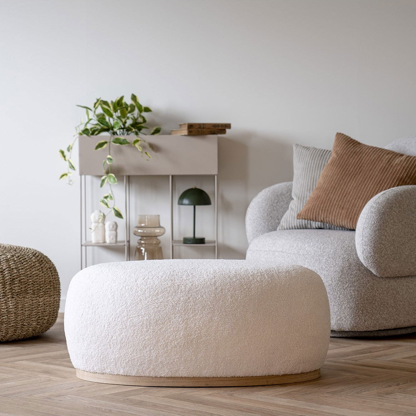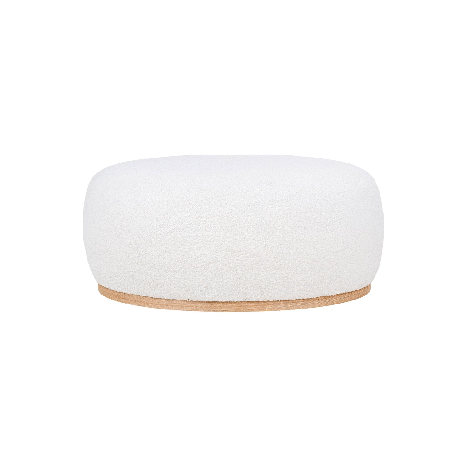 Den lave og avrundede formen gir et rolig uttrykk, mens den hvite teddyoverflaten skaper en varm og behagelig tekstur i rommet. Den generøse størrelsen gjør puffen ideell som ekstra sitteplass, lav benk eller et mykt midtpunkt i stuen. Den lyse tonen gjør den enkel å kombinere med både treverk, lyse tekstiler og mørkere kontraster.