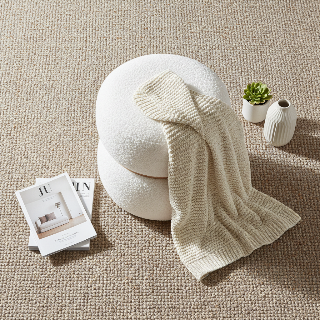 Den runde formen kombinert med myk bouclé gir en lun følelse i rommet, og den kompakte størrelsen gjør den enkel å plassere der du trenger en ekstra sitteplass eller et dekorativt element. Den passer perfekt når du vil skape en mer innbydende atmosfære uten å fylle rommet for mye.